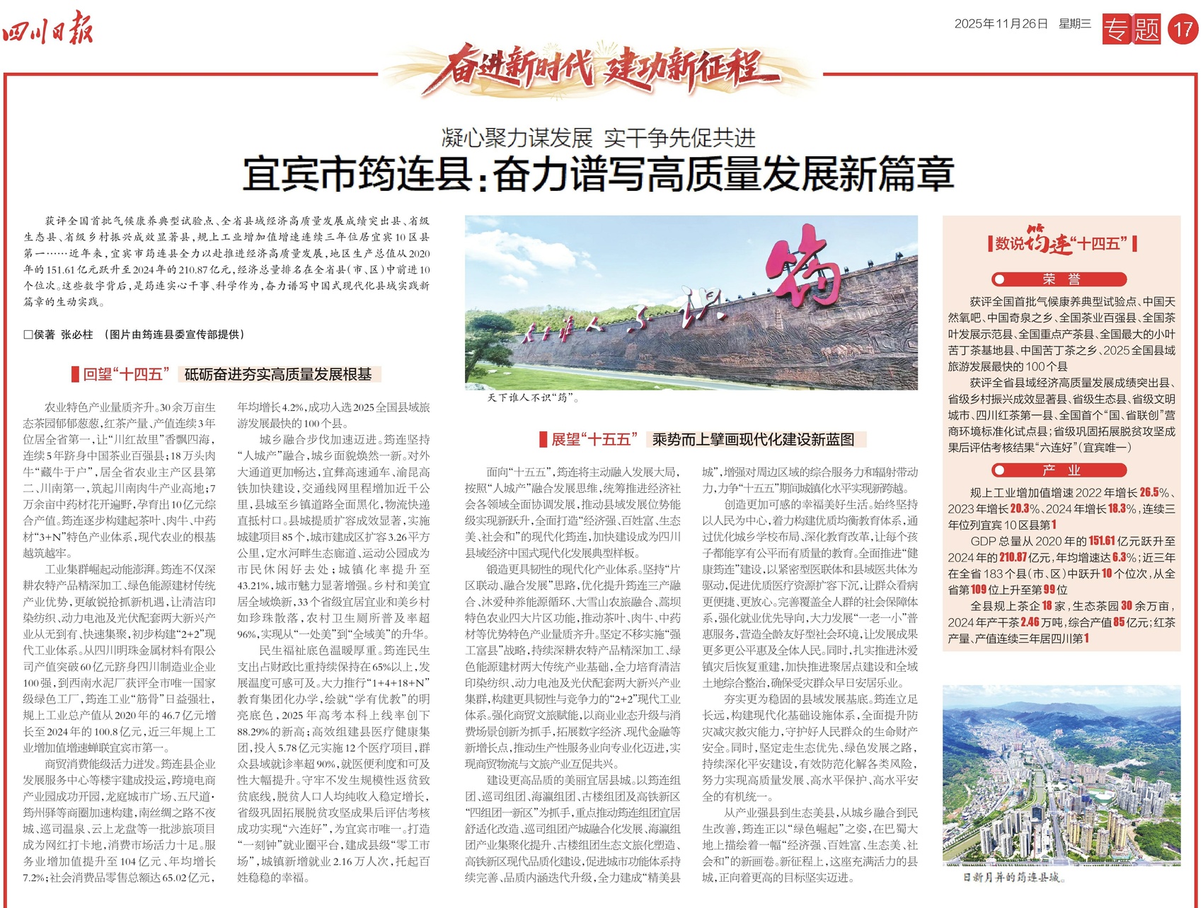 从产业强县到生态美县,从城乡融合到民生改善,筠连正以“绿色崛起”之姿,在巴蜀大地上描绘着一幅“经济强、百姓富、生态美、社会和”的新画卷。新征程上,这座充满活力的县城,正向着更高的目标坚实迈进。