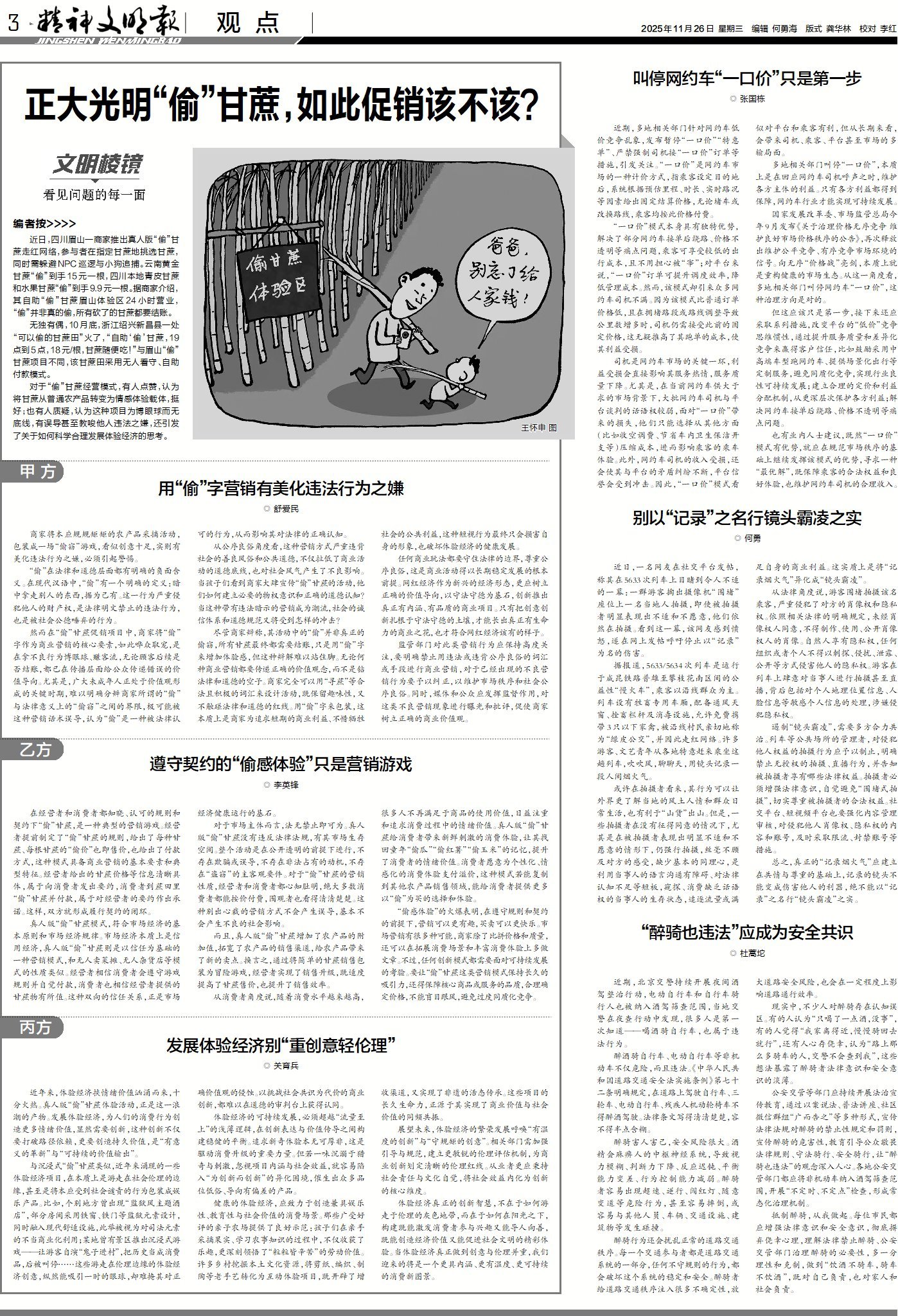 尽管商家辩称,其活动中的“偷”并非真正的偷窃,所有甘蔗最终都需要结账,只是用“偷”字来增加体验感,但这种辩解难以站住脚。无论何种商业营销都要传递正确的价值观念,而不是钻法律和道德的空子。商家完全可以用“寻蔗”等合法且积极的词汇来设计活动,既保留趣味性,又不触碰法律和道德的红线。用“偷”字来包装,这本质上是商家为追求短期的商业利益、不惜牺牲社会的公共利益,这种短视行为最终只会损害自身的形象,也破坏体验经济的健康发展。