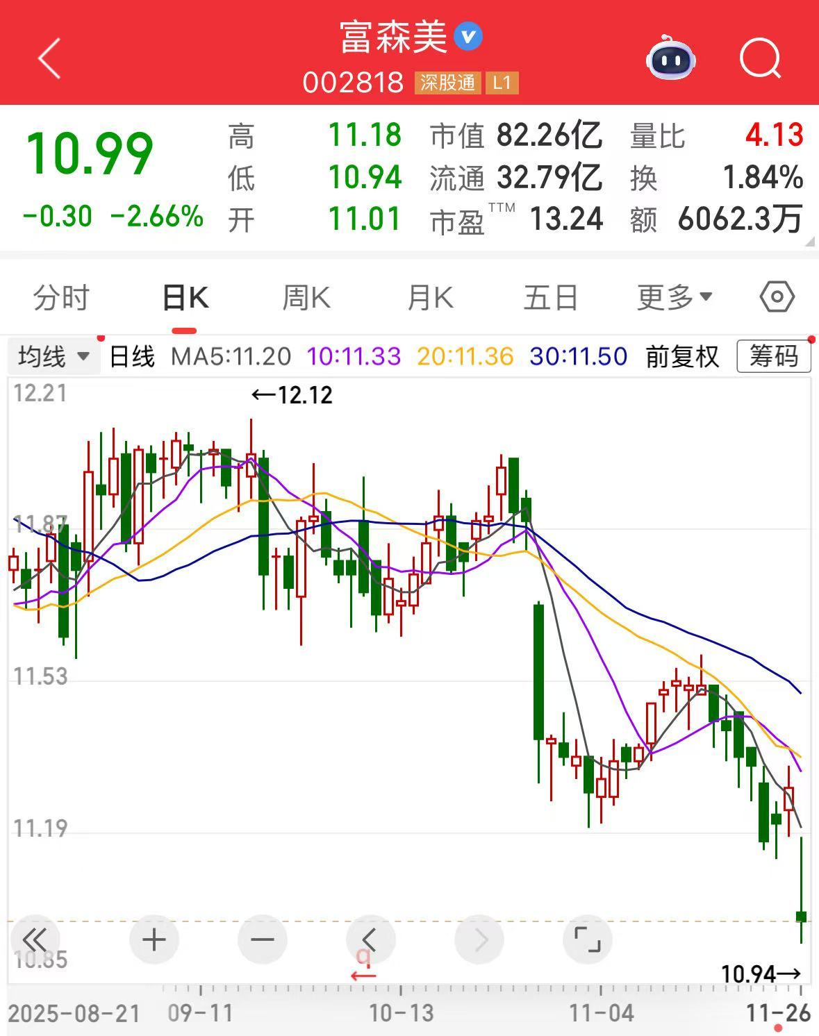 二级市场方面,截至11月26日午间收盘,富森美报10.99元元/股,下跌2.66%,总市值82.26亿元。