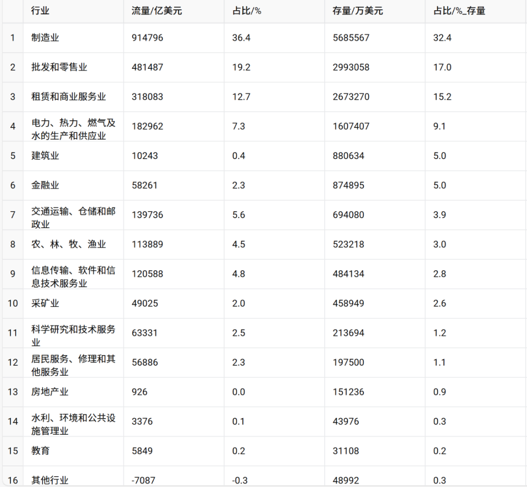根据联合国贸易和发展会议(UNCTAD)发布的《2021年世界投资报告》统计数据显示,2020年中国对外直接投资总量实现历史性突破,以1537亿美元的规模首次位居全球首位,较上年增长幅度达12.3%。从全球份额视角看,中国对外直接投资流量占比从2012年的6.3%逐年攀升,至2020年已占据全球总量的五分之一(20.2%),这一增长轨迹显著体现了中国在全球资本流动格局中的驱动作用。[4]以东盟地区为例,制造业仍然是中国企业最主要的投资领域,占总投资的32.4%。随着中国制造业的不断升级,向智能化和绿色化转型,制造业引领着中国企业在东盟各国的投资持续提升。紧随其后的是批发和零售业,占投资额的17%,体现了中国企业在东南亚市场,尤其是在跨境电商等领域的强大竞争力(见表一)。此外,租赁和商业服务业、信息传输与技术服务业等领域的投资也呈现快速增长,特别是在高科技和服务业的国际化发展上,中国企业的布局愈加广泛。再以非洲为例,中国在非洲的投资也逐年增加,虽然流量不大,2023年仅占总投资流量的2.2%,但是同比增速是“一带一路”区域中最快的(118.8%)。[5]