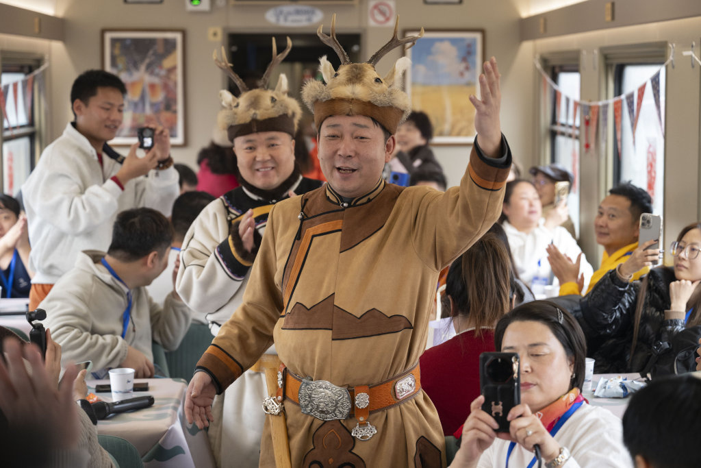 11月26日,在Y783次“悠享龙江·银旅号”旅游列车上,鄂伦春族演员在表演。