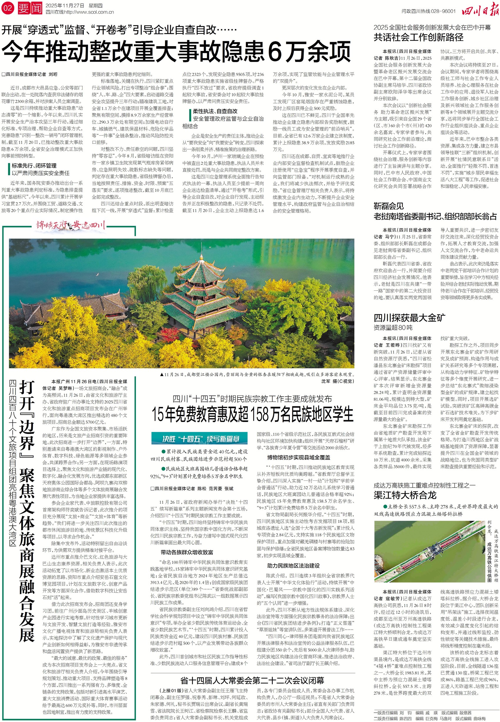 11月26日,2025四川省文化和旅游重点招商项目发布会在广州举行,面向粤港澳大湾区精选480个文旅项目,邀请多领域企业共谋跨界合作,聚焦文体旅商展融合发展。活动通过集中发布和自由洽谈环节帮助供需双方精准对接,今日二版,看四川如何打开“边界”,解锁文旅合作无限可能。