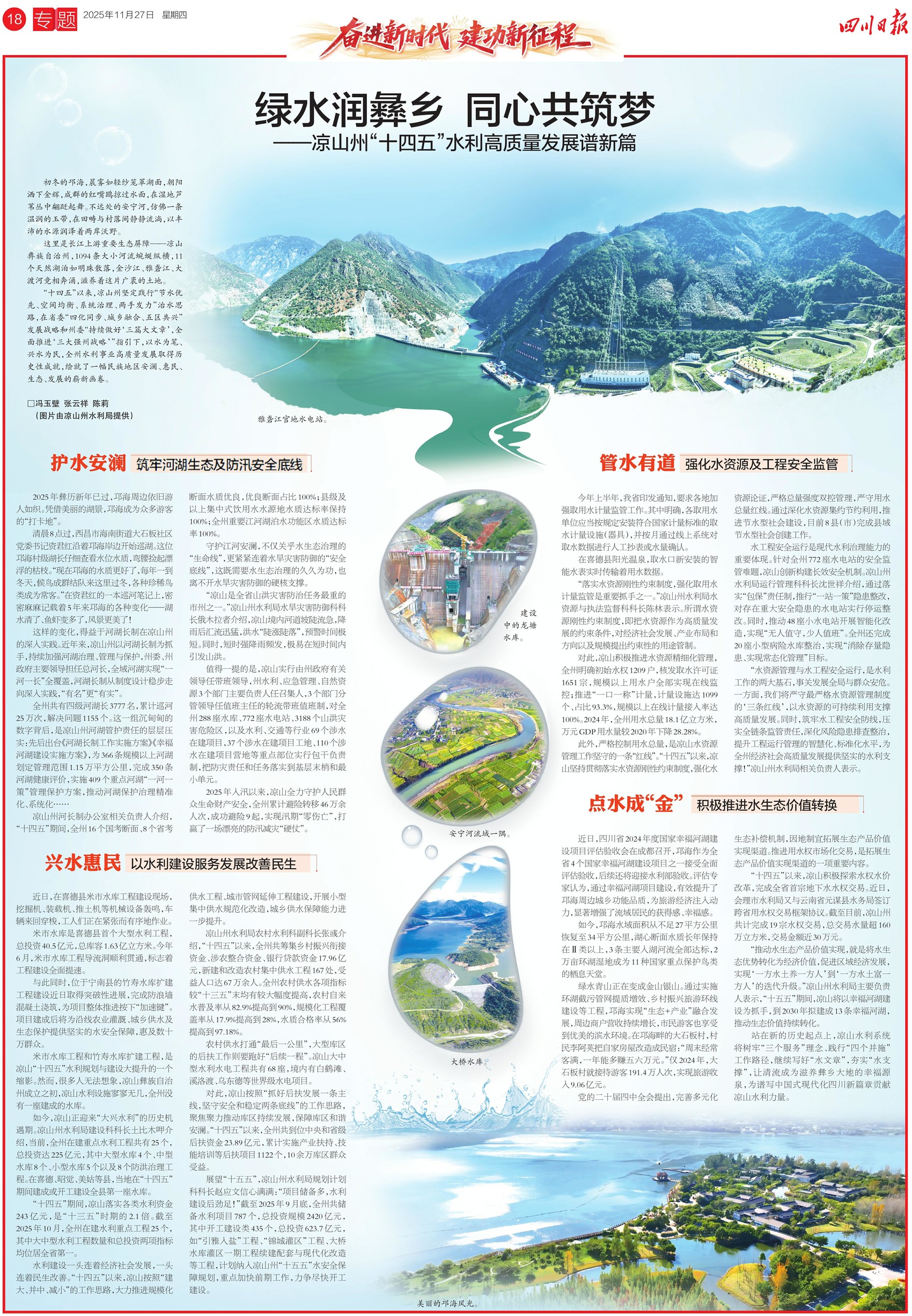 “十四五”以来,凉山州坚定践行“节水优先、空间均衡、系统治理、两手发力”治水思路,在省委“四化同步、城乡融合、五区共兴”发展战略和州委“持续做好‘三篇大文章’,全面推进‘三大强州战略’”指引下,以水为笔、兴水为民,全州水利事业高质量发展取得历史性成就,绘就了一幅民族地区安澜、惠民、生态、发展的崭新画卷。