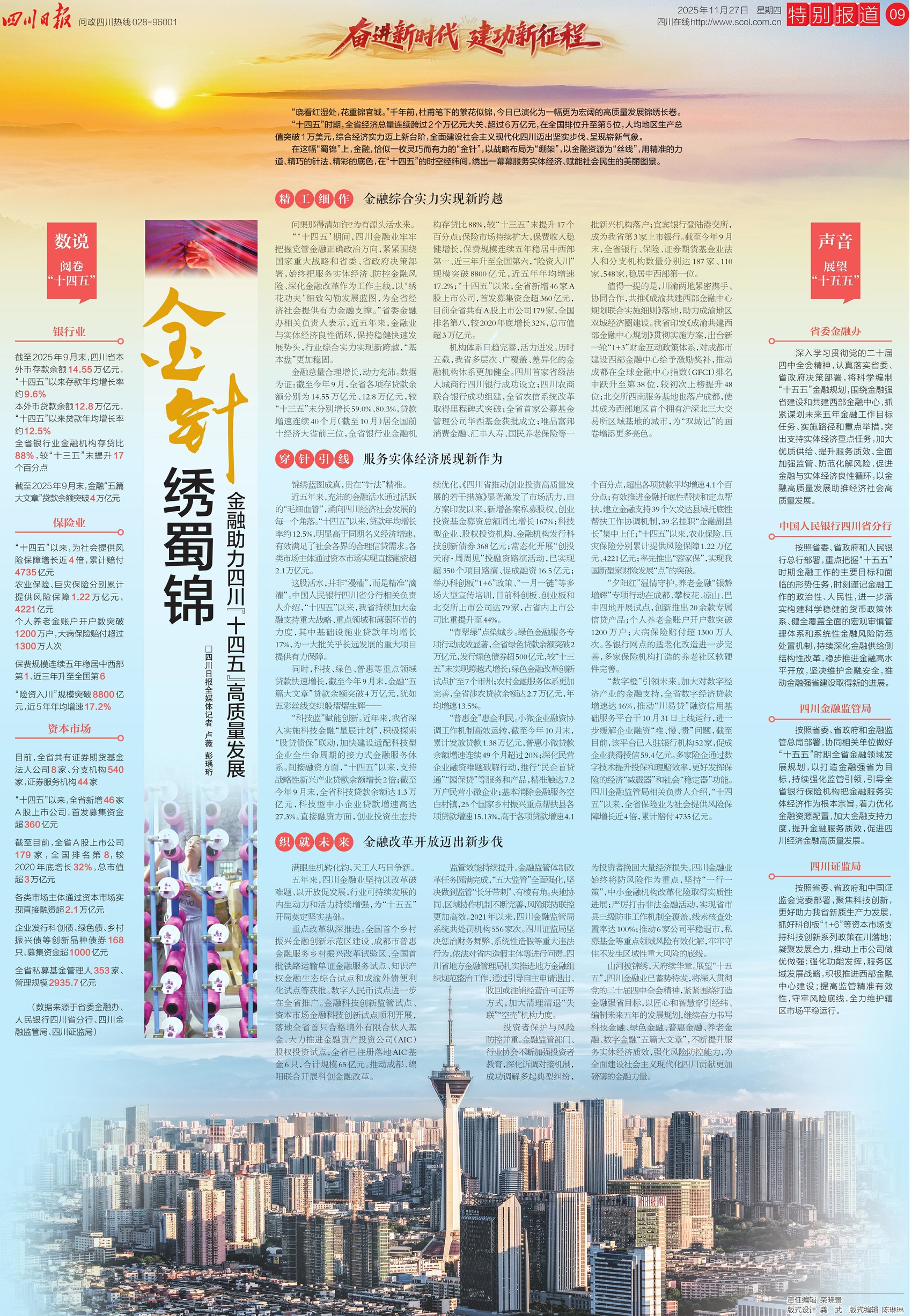 山河披锦绣,天府续华章。展望“十五五”,四川金融业已蓄势待发,将深入贯彻党的二十届四中全会精神,紧紧围绕打造金融强省目标,以匠心和智慧穿引经纬、编制未来五年的发展规划,继续奋力书写科技金融、绿色金融、普惠金融、养老金融、数字金融“五篇大文章”,不断提升服务实体经济质效,强化风险防控能力,为全面建设社会主义现代化四川贡献更加磅礴的金融力量。