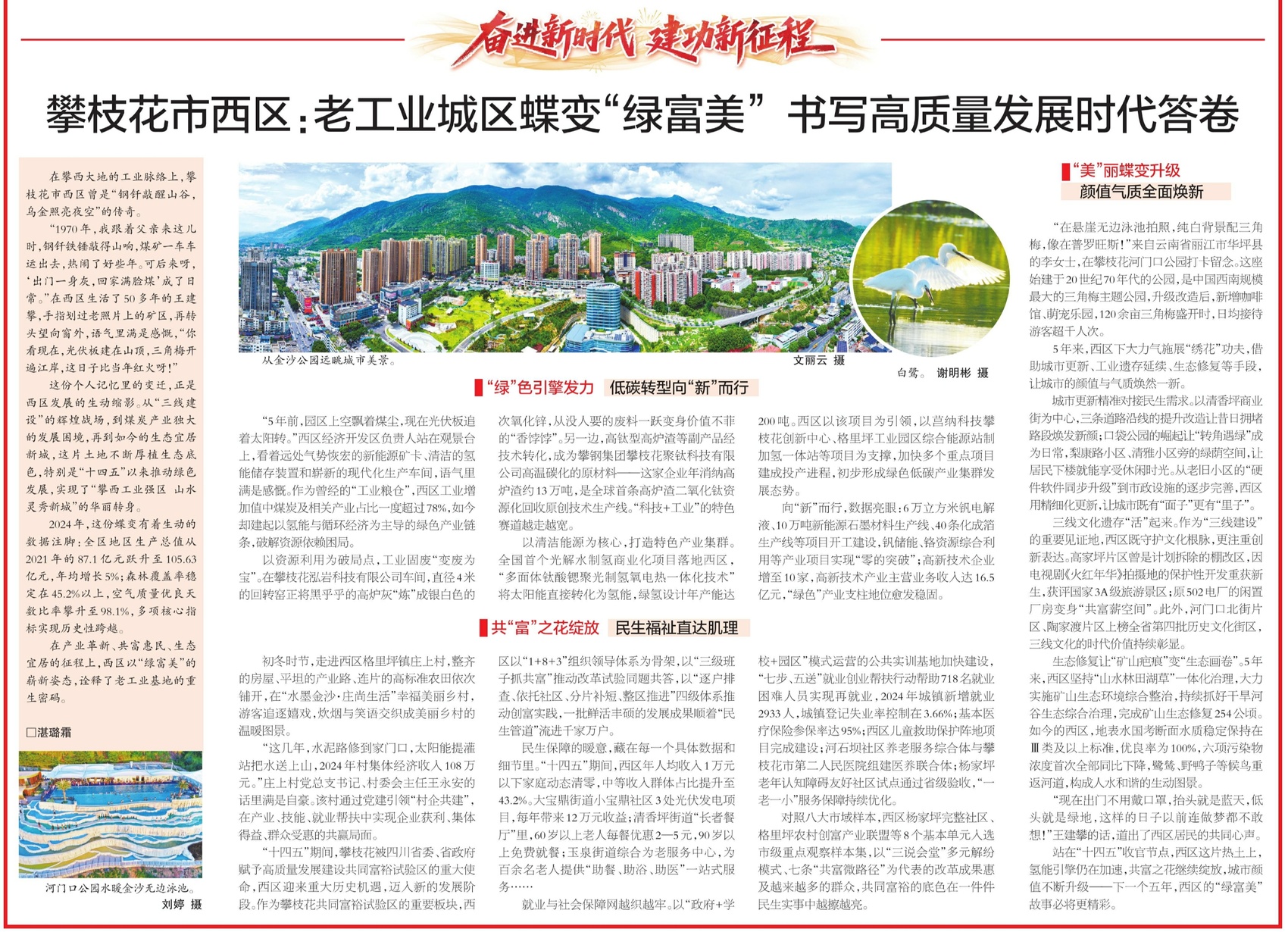 生态修复让“矿山疤痕”变“生态画卷”。5年来,西区坚持“山水林田湖草”一体化治理,大力实施矿山生态环境综合整治,持续抓好干旱河谷生态综合治理,完成矿山生态修复254公顷。如今的西区,地表水国考断面水质稳定保持在Ⅲ类及以上标准,优良率为100%,六项污染物浓度首次全部同比下降,鹭鸶、野鸭子等候鸟重返河道,构成人水和谐的生动图景。