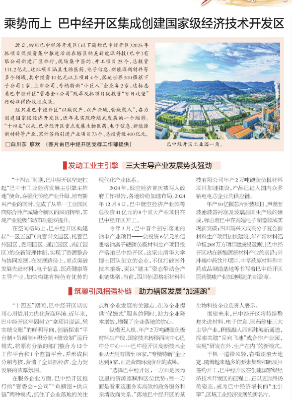 展望未来,巴中经开区将持续聚焦先进材料、电子信息、医药健康三大主导产业,积极融入西部陆海新通道,探索共建“反向飞地”或合作产业园,实现“研发在外、生产在内”的新模式。