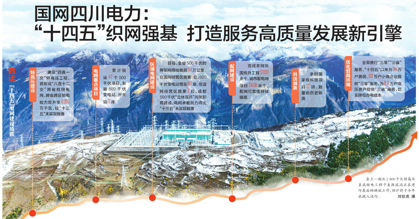 特高压建设方面,“十四五”期间,国家电网在四川建设“四直一交”特高压工程,雅中—江西、白鹤滩—江苏、白鹤滩—浙江±800千伏特高压直流输电工程以及川渝1000千伏特高压交流输电工程相继建成投运,金上—湖北特高压工程也将于今年内投运。到年底,四川将形成“八直十二交”跨省枢纽电网,与华东、华中、西北及重庆、西藏等地电网互联,跨省跨区输电能力提升至6260万千瓦,较“十三五”末实现翻番。