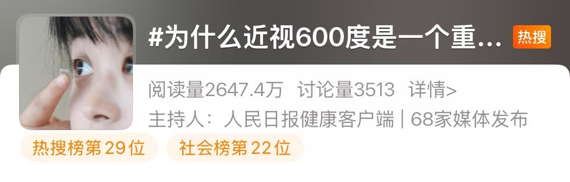 近日,微博话题#为什么近视600度是一个重要分界线#冲上热搜,同时,话题#成年后近视加深的三大元凶#引发热议。