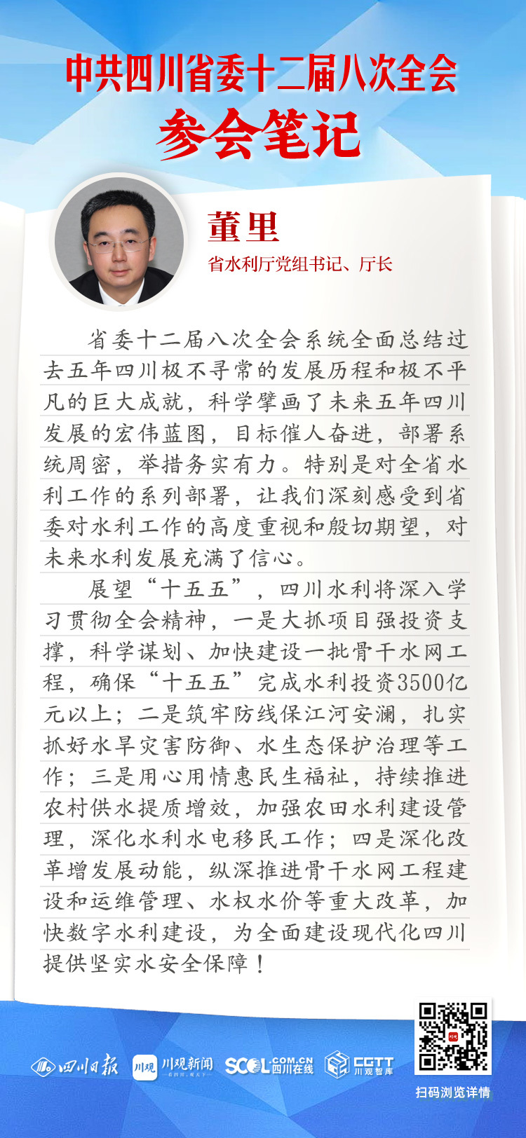 省委十二届八次全会系统全面总结过去五年四川极不寻常的发展历程和极不平凡的巨大成就,科学擘画了未来五年四川发展的宏伟蓝图,目标催人奋进,部署系统周密,举措务实有力。特别是对全省水利工作的系列部署,让我们深刻感受到省委对水利工作的高度重视和殷切期望,对未来水利发展充满了信心。