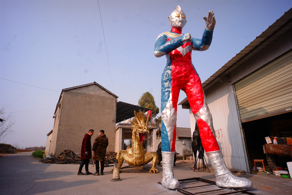司空见惯的废旧轮胎,经手工打造,化身为长8米的巨龙、高5.6米的奥特曼、重1吨多的黑金刚……近日,在绵阳市安州区塔水镇桂溪村,一件件由废旧轮胎制作而来的艺术品因造型惟妙惟肖、雄壮霸气,不仅上了网络“热搜”,还引得媒体及周边群众慕名而来。
