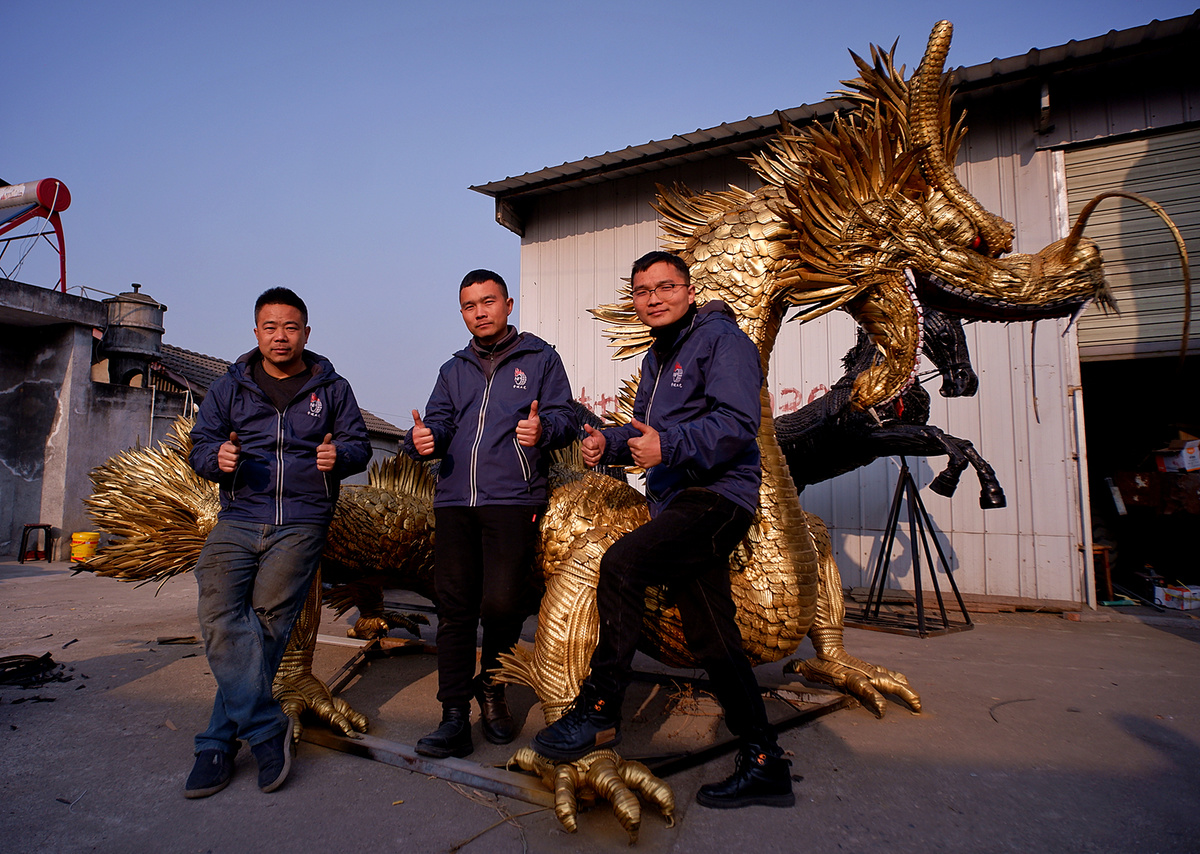 让轮胎“变废为宝”的是该村邱春宝、邱春勇、范家兵三兄弟。1月14日,记者在“废胎兄弟”工作室看到,三兄弟正在加紧制作狼、鼠等新作。一旁成品巨龙金光灿灿,栩栩如生,壮牛周身漆黑,威风凌凌。轮胎所具有的肌理和纹路赋予作品特有的力量感和神秘感。