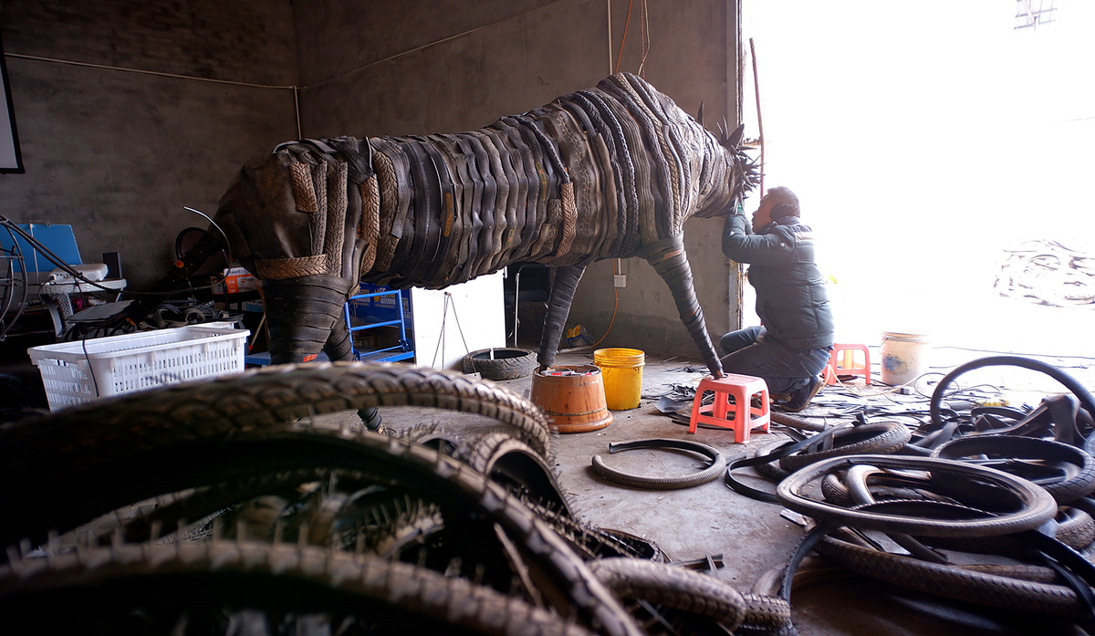在作品制作中,先要用钢筋搭建“骨架”,再用轮胎填充“肌肉”、敷上“皮肤”,最后用丙烯颜料做“衣服”,看似简单的流程,却需要大量繁琐的工作。“钢筋框架搭建好后,要用铡刀、剪刀等将橡胶车带按需切割成不同形状的条状,在用汽钉一点点镶嵌上去。”邱春勇说,做一个轮胎雕塑,需要裁剪上万块轮胎碎片,如还在制作中的金刚,为了营造一缕缕逼真的毛发感,目前已经制作两个多月了。“我们计划打造12生肖,到时候一起展出,一定会很震撼。”