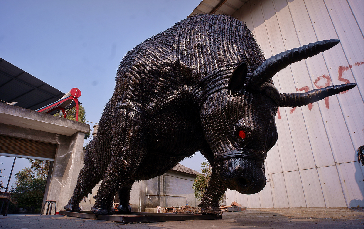 牛年应景,“废胎兄弟”打造的壮牛周身漆黑,威风凌凌。