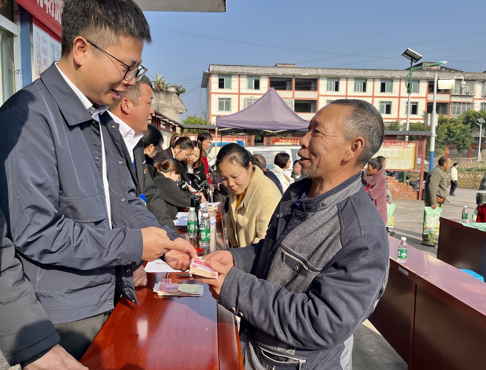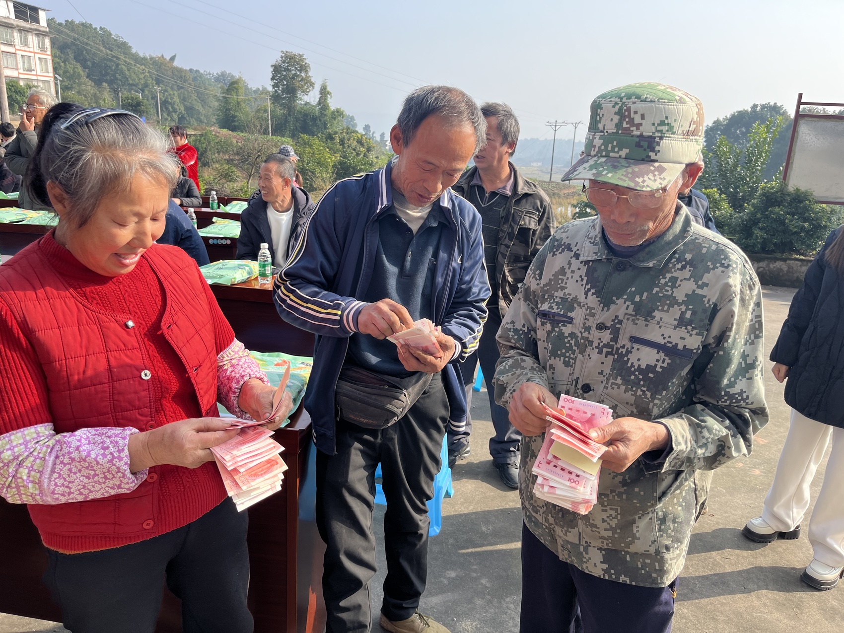 11月27日9时许,初冬的暖阳洒在合江县望龙镇张白垇村村委会,100余名村民齐聚一堂,领取2025年村集体分红。61岁的村民杨光有数着刚领的5000余元现金,笑得合不拢嘴:“年龄大了在家门口就能挣钱,肯定开心!”他今年通过参与村集体的插秧、收水稻等劳动获得了这份收入。
