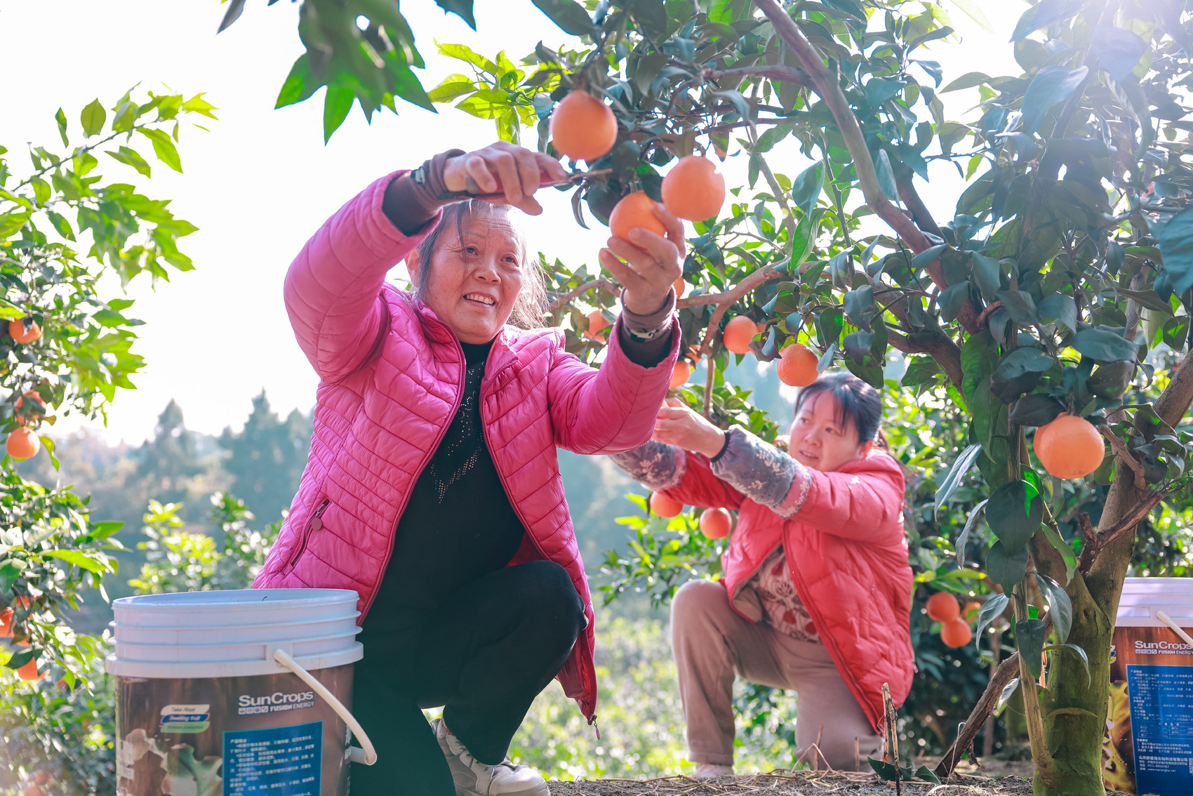 果园里,果农忙着采摘鲜果;分拣车间内,村民们正熟练地为橙子分级、套网、装箱。这些带着橘香的果实正排队等待发往成都、西安等地的生鲜超市。