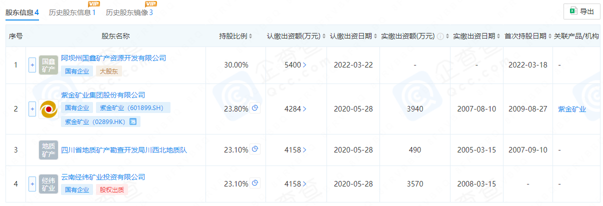 企查查APP显示,松潘县紫金工贸有限责任公司成立于2005年,注册资本1.8亿元,法定代表人、董事长为李昕,经营范围为矿产资源勘查。该企业由四方共同持股:阿坝州国鑫矿产资源开发有限公司持股30%,为第一大股东;紫金矿业集团股份有限公司(下称“紫金矿业”)持股23.8%;四川省地质矿产勘查开发局川西北地质队持股23.1%;云南经纬矿业投资有限公司持股23.1%。