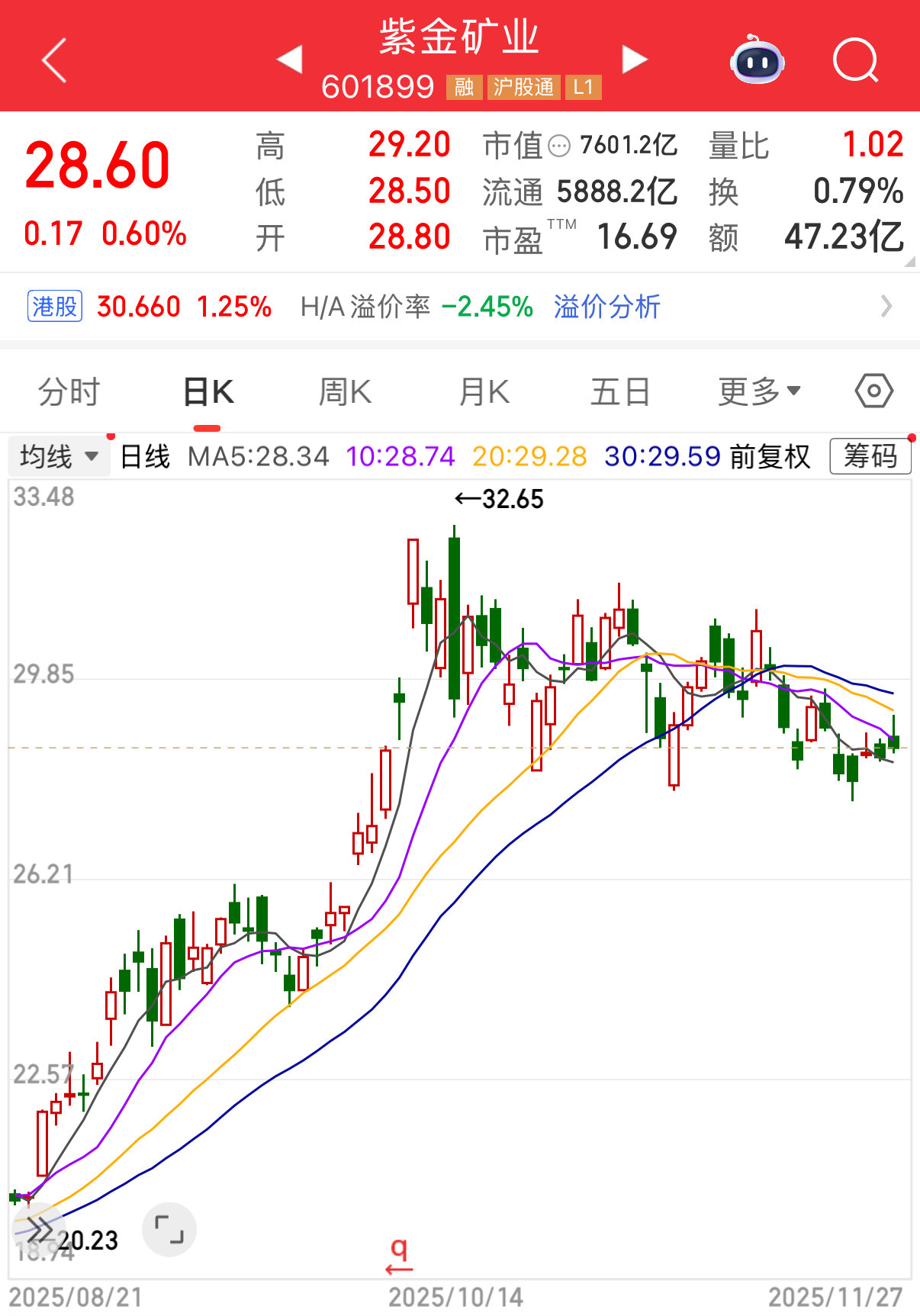 二级市场方面,截至27日收盘,紫金矿业报28.6元/股,总市值7601.2亿元。