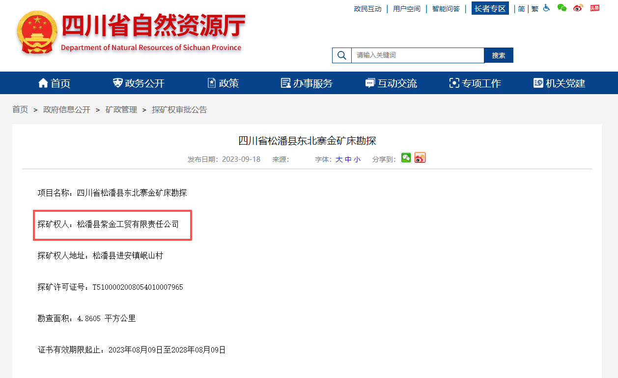 据四川省自然资源厅,四川省松潘县东北寨金矿床勘探项目探矿权人为松潘县紫金工贸有限责任公司,勘查面积4.8605平方公里,证书有效期限起止为2023年8月9日至2028年8月9日。