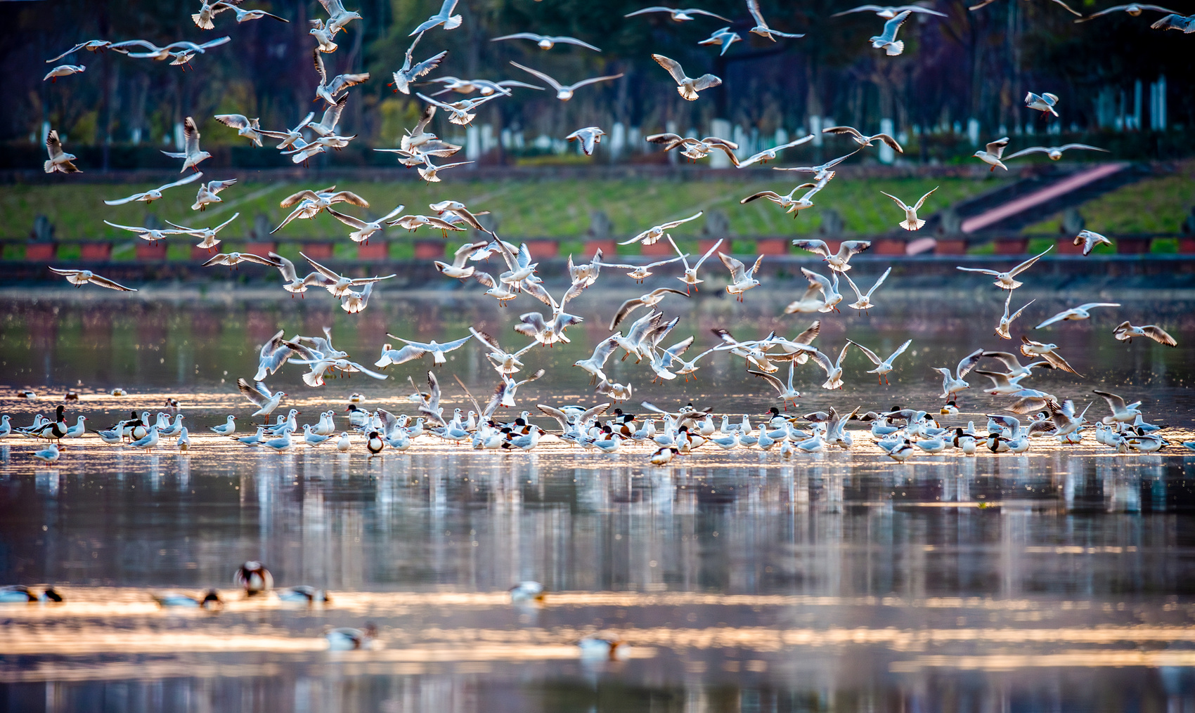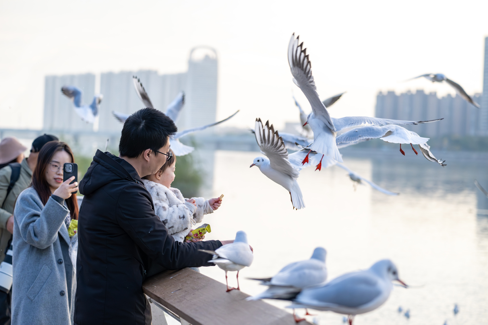 观景台上空,红嘴鸥成群翩跹,它们时而低飞掠过人群,时而轻点湖面,与岸边的市民和志愿者亲密互动。不远处的湖面上,斑嘴鸭、绿头鸭等水鸟悠然栖息,吸引众多摄影爱好者频频按下快门,记录它们灵动的瞬间。