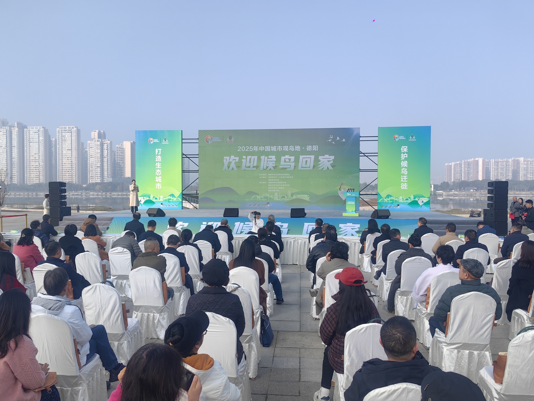 11月27日,德阳金锣湾生态公园迎来了一场人与自然的温情相约。数百名市民与爱鸟者齐聚水岸,在“欢迎候鸟回家”活动中,共同迎接远道而来的“空中精灵”——成千上万只候鸟,如约回到这座“重装之都”过冬。