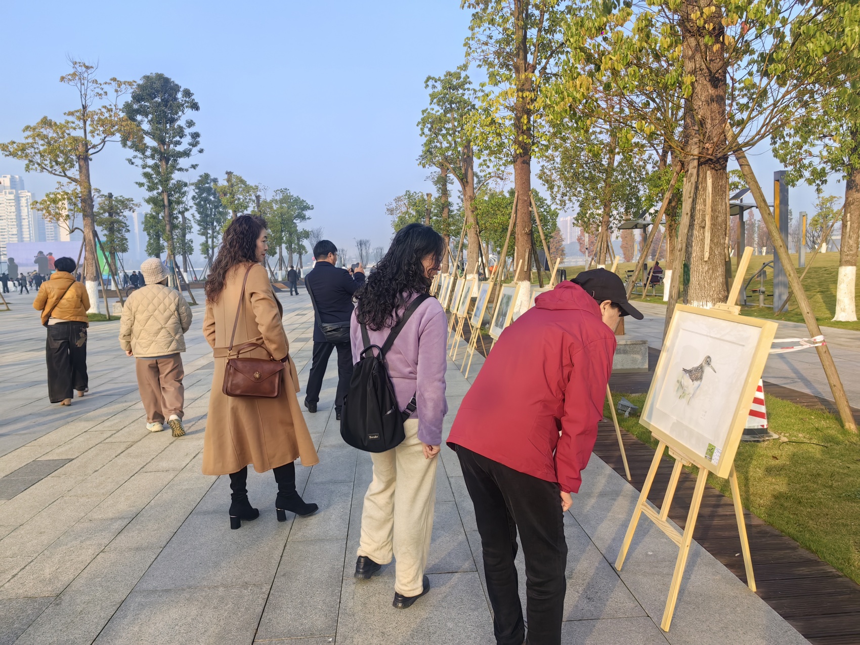市民驻足欣赏旌湖候鸟主题画展。周玉琴 摄