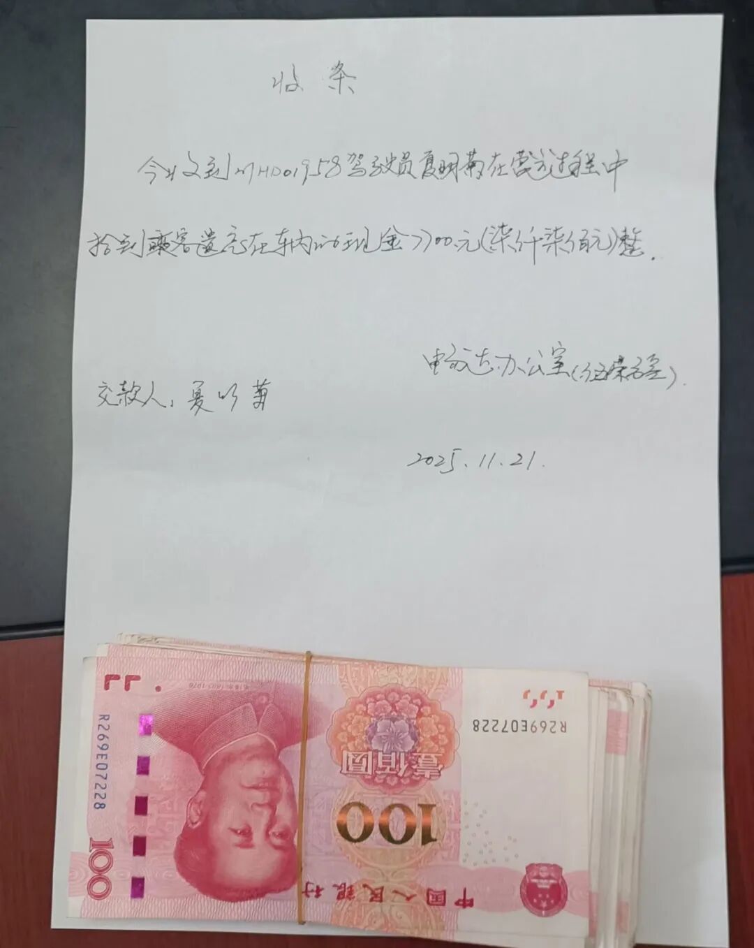 于是,夏明菊便将该情况告诉了正在乘车的乘客,乘客按照她的要求编辑了遗失物品及联系电话,通过支付记录后台给中年男子留言。随后,她拨打了公司相关负责人电话,说明情况并进行报备。当天11时许,她将7700元现金送到了公司。工作人员再次清点了后写下了一张收条。但等了几天,失主仍未联系,于是夏明菊和公司工作人员报了警。