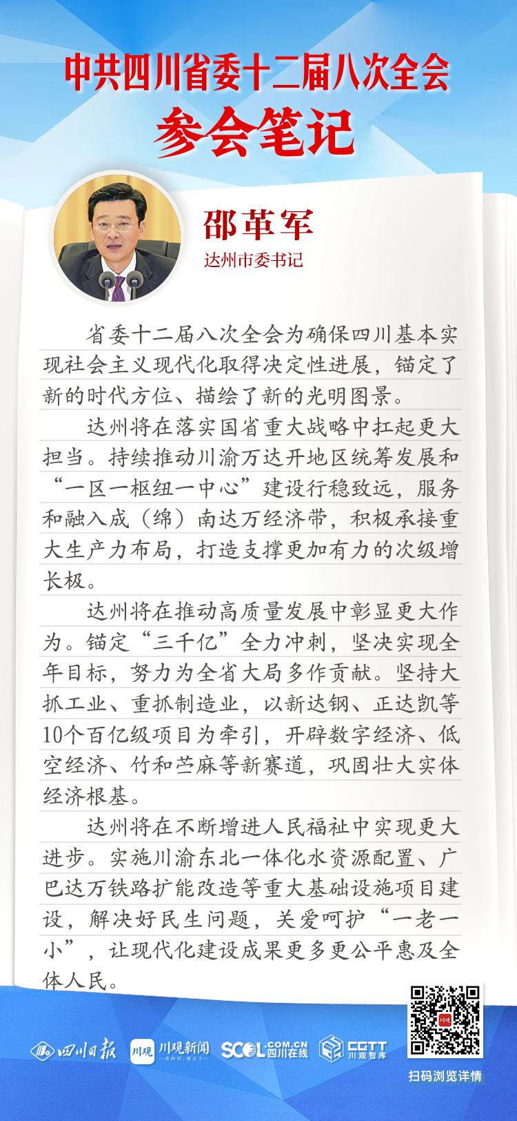 达州将在推动高质量发展中彰显更大作为。锚定“三千亿”全力冲刺,坚决实现全年目标,努力为全省大局多作贡献。坚持大抓工业、重抓制造业,以新达钢、正达凯等10个百亿级项目为牵引,开辟数字经济、低空经济、竹和苎麻等新赛道,巩固壮大实体经济根基。