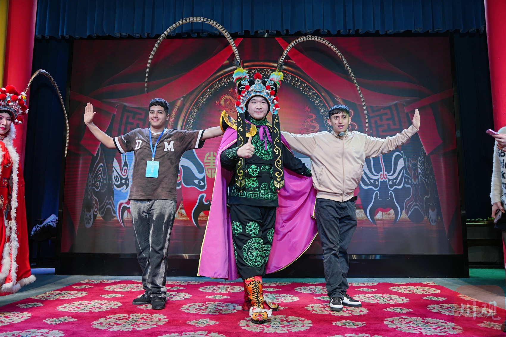 一曲唱罢,台下的国内国际大V纷纷走上舞台和演员合影。大家模仿表演身段、吟唱经典台词,现场笑声不断。