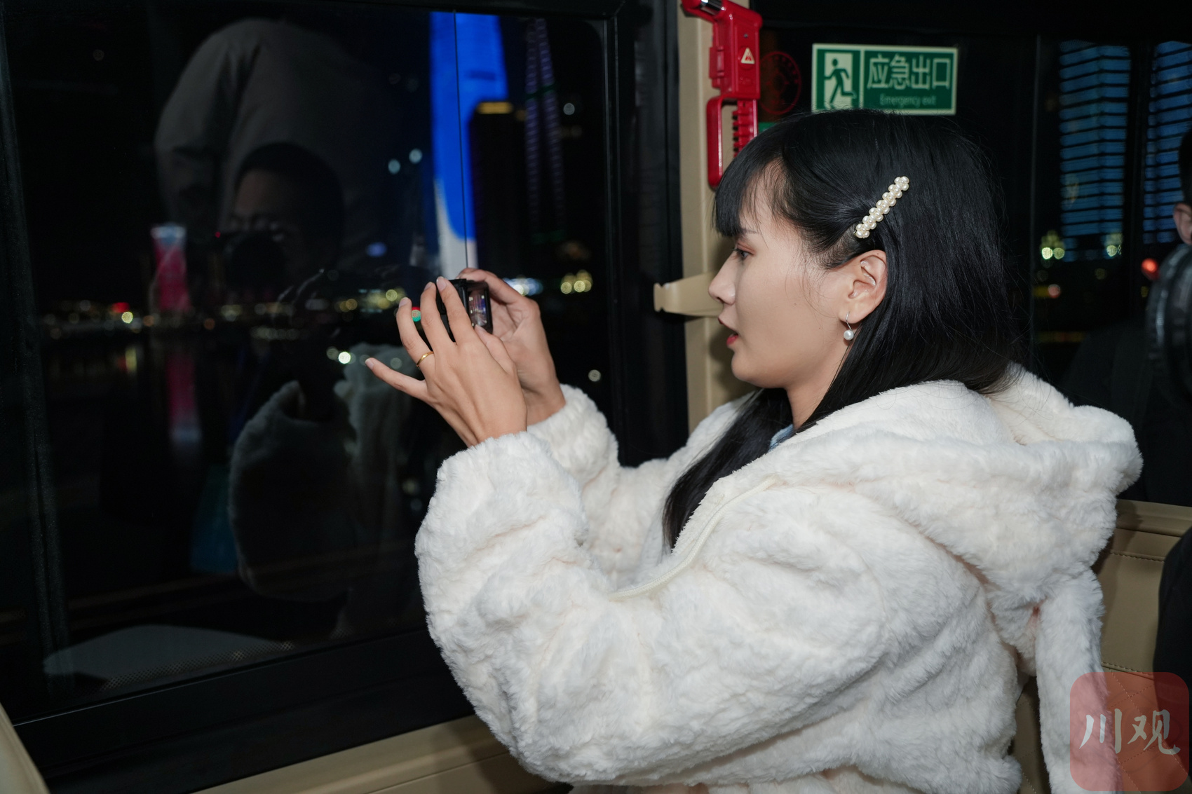 双层观光巴士上,采风团成员记录下宜宾夜景。
