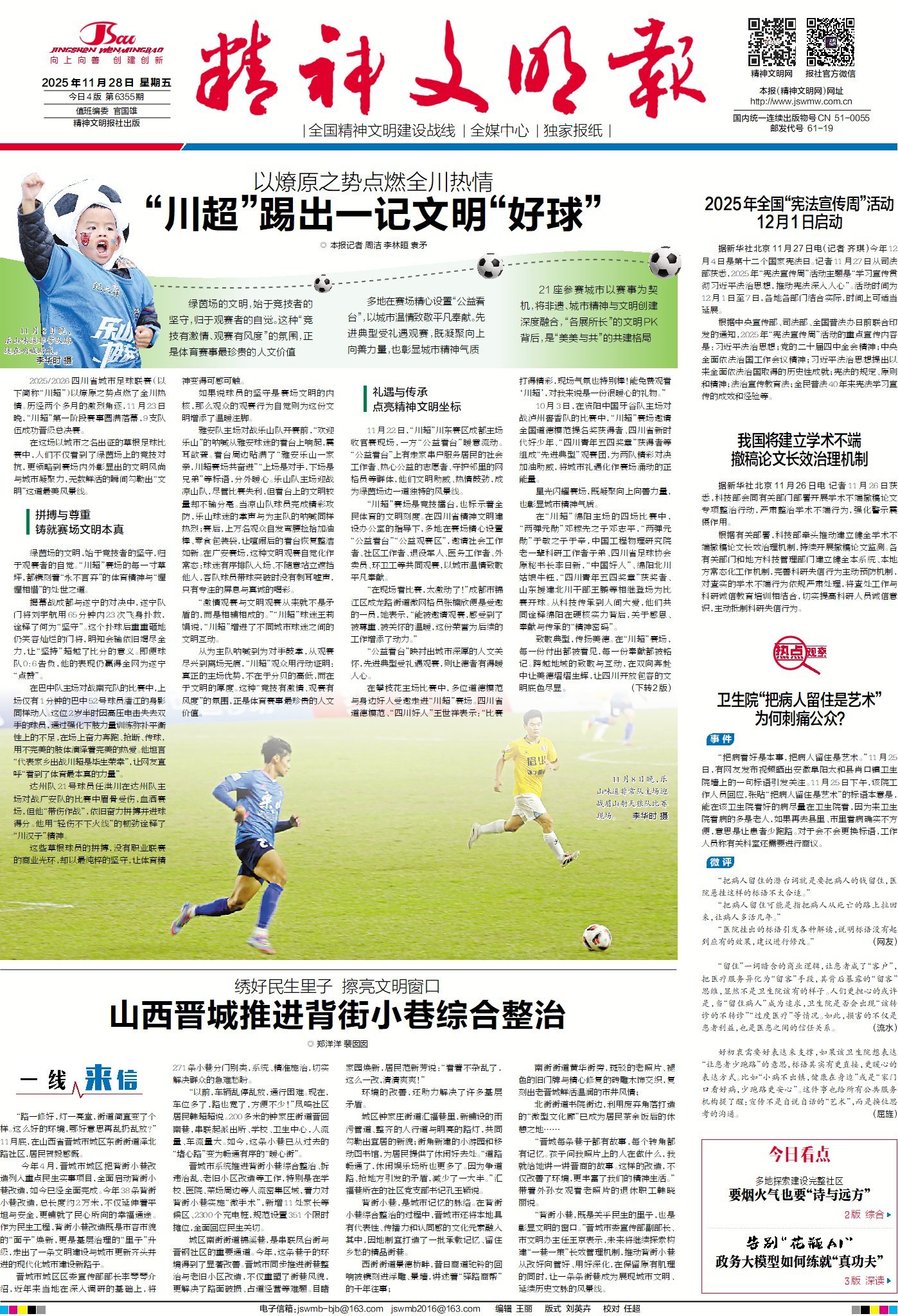 今日版面“早”知道:1版头条聚焦“川超”如何踢出一记文明“好球”;《热点观察》栏目探讨卫生院标语“把病看好是本事,把病人留住是艺术”引发的争议;2版综合版关注城市更新,深入了解多地如何探索建设完整社区;3版《深读》探讨当AI与政务相结合,大模型如何练就“真功夫”。更多精彩尽在本期报纸,赶紧看起来!