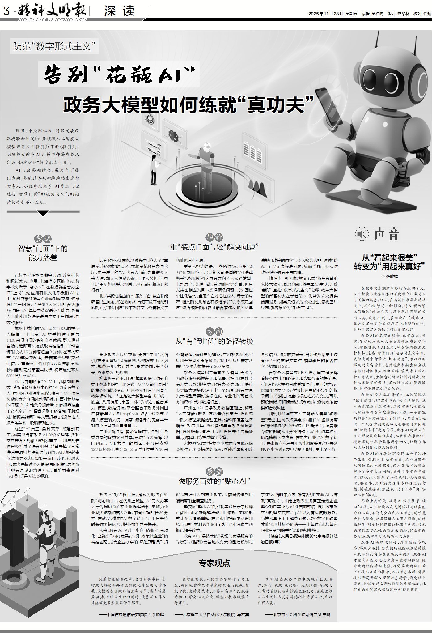 近日,中央网信办、国家发展改革委联合印发《政务领域人工智能大模型部署应用指引》,明确提出政务AI大模型部署应务求实效,切实防范“数字形式主义”。 AI与政务相结合,成为当下热门方向。各地政务机构纷纷推出虚拟数字人、小程序应用等“AI员工”,但这些“智慧门面”的能力与人们的期待仍存在不小差距。政务大模型如何练就“真功夫”?本期《深读》予以探讨。【详情】