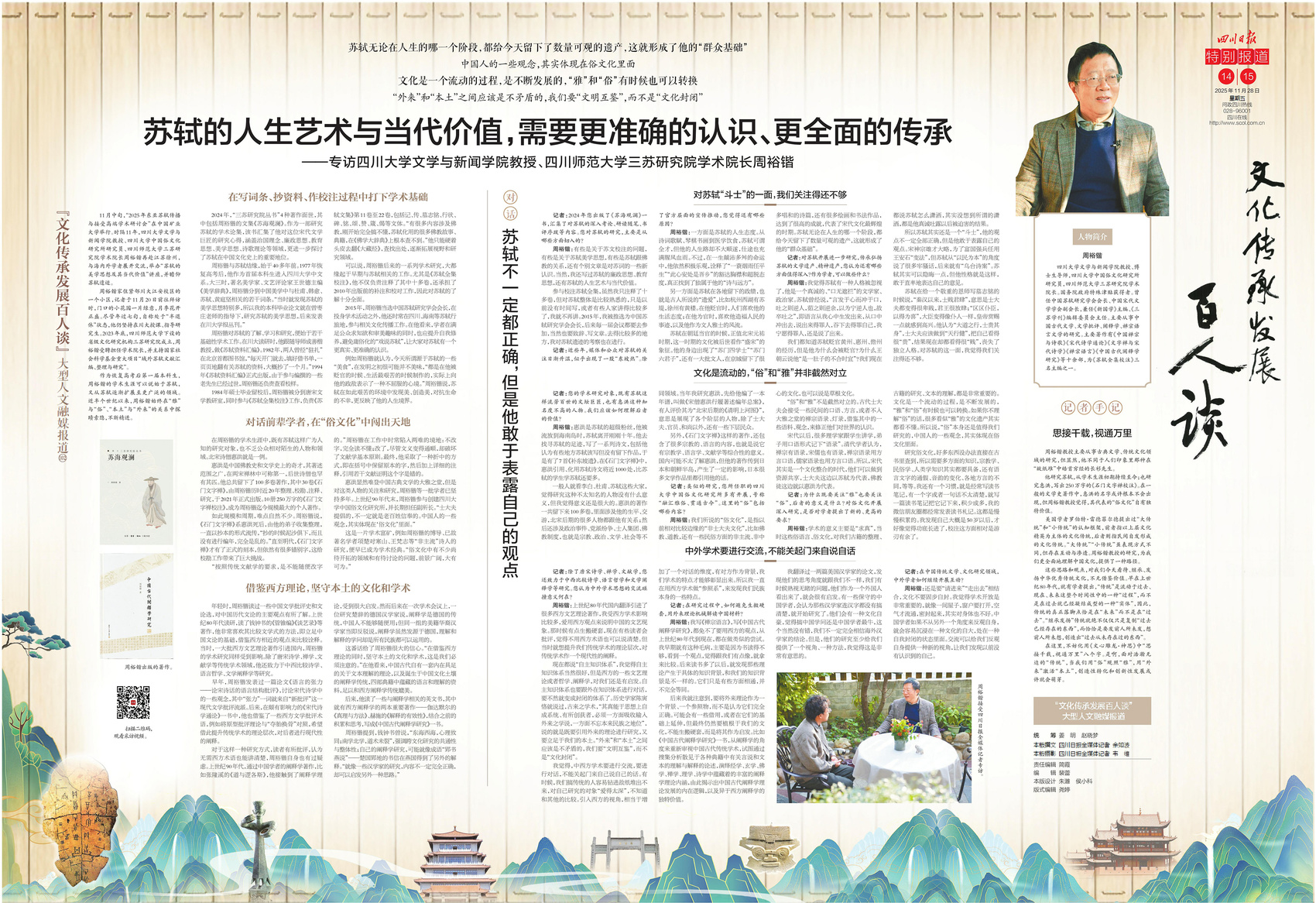 四川日报全媒体“文化传承发展百人谈”大型人文融媒报道持续推出,今日《四川日报》连版推出第102期,专访四川大学文学与新闻学院教授、四川师范大学三苏研究院学术院长周裕锴。