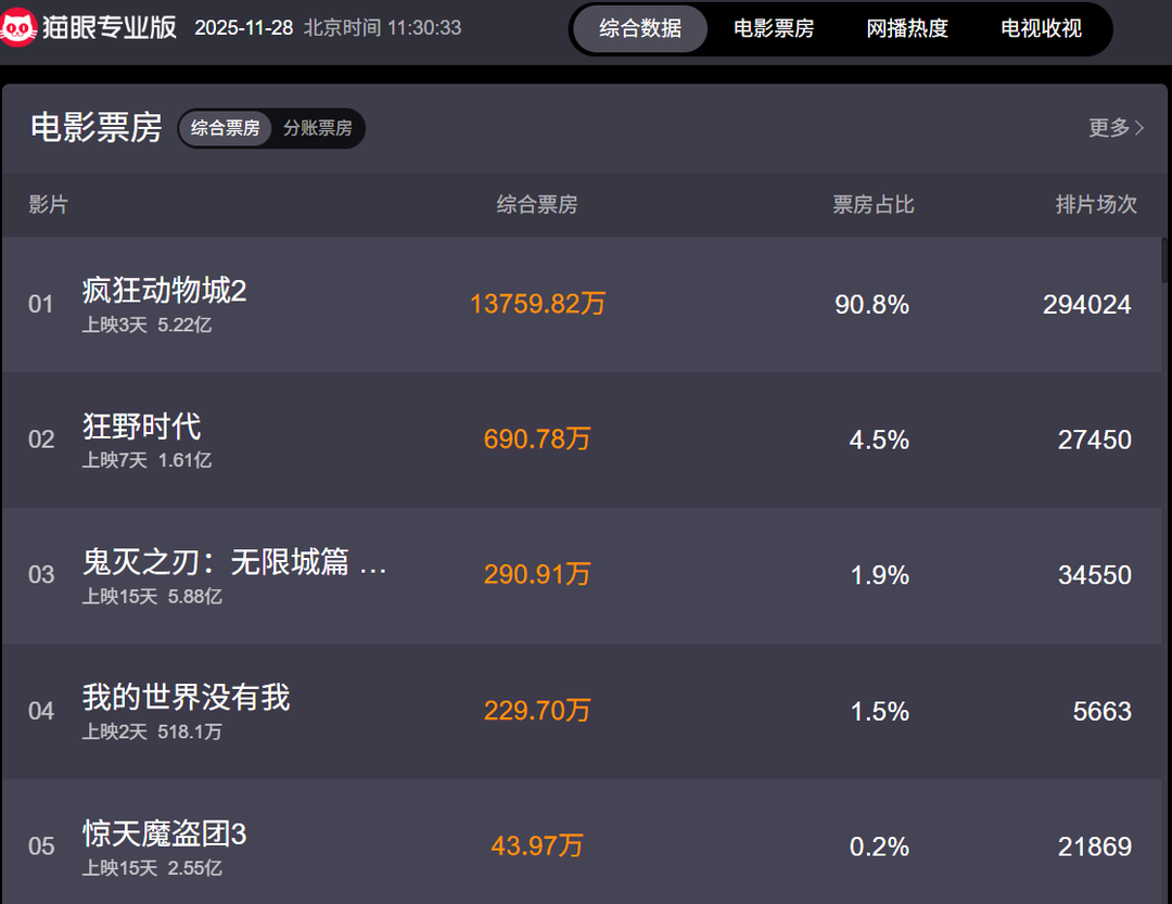 影片上映前后,“部分影院只放映疯狂动物城2原版”、“首批观众反馈”、“零点场几乎满座”、“有影院排片80%”等多个相关词条登上热搜,足见观众对这部续作的热情。事实上,爆款影片对当下电影市场来说极其重要。据国家电影局数据,2025年国庆档电影票房同比下降13%。今年第二季度电影市场遇冷,全国电影票房同比下降34.73%。《疯狂动物城2》的热映至少让影院能够获得一波宝贵的现金流。