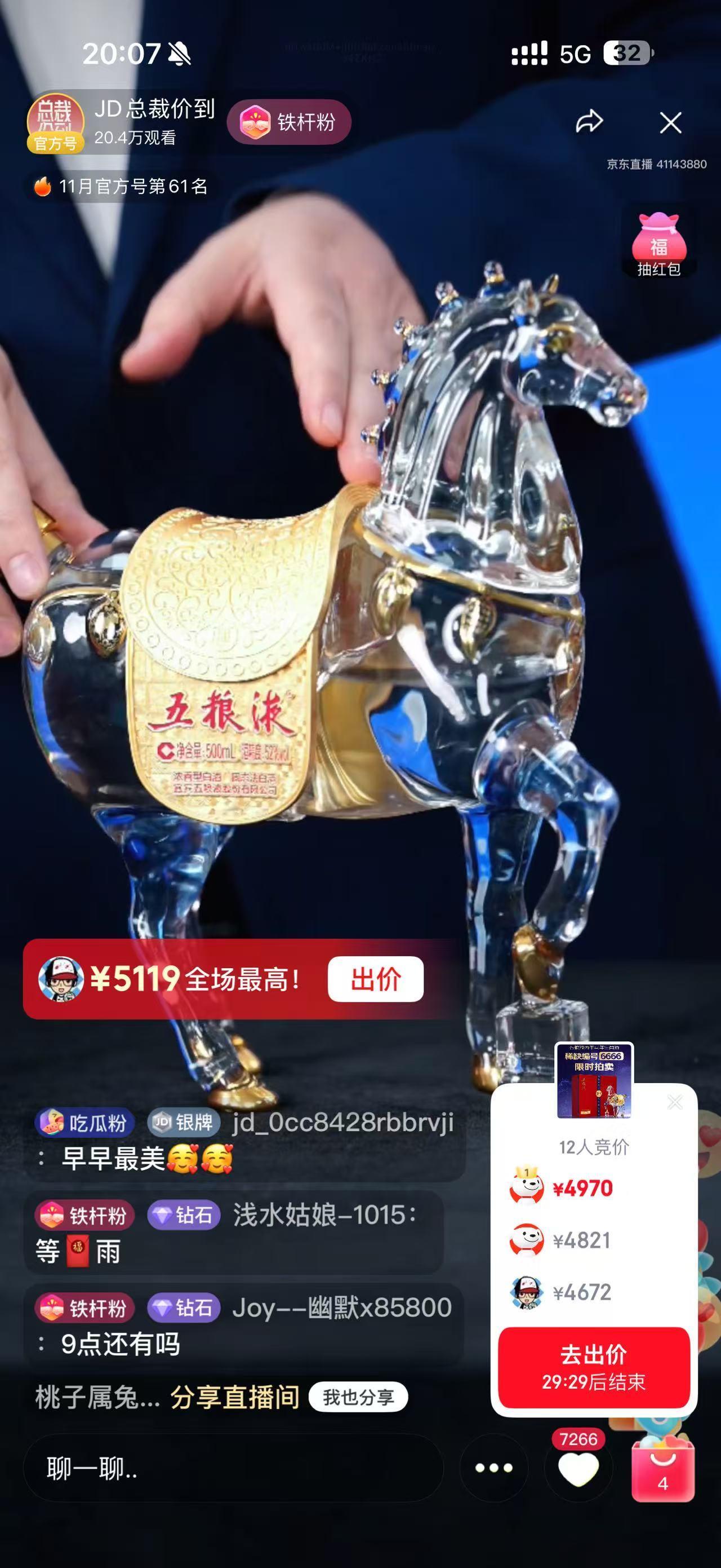 岁末,“飒露紫”骐骥一跃,跃上一瓶“和美”五粮液。11月27日,五粮液丙午马年生肖酒“飒露紫”在京东首发,三款特殊编号产品拍卖“点燃”直播间。