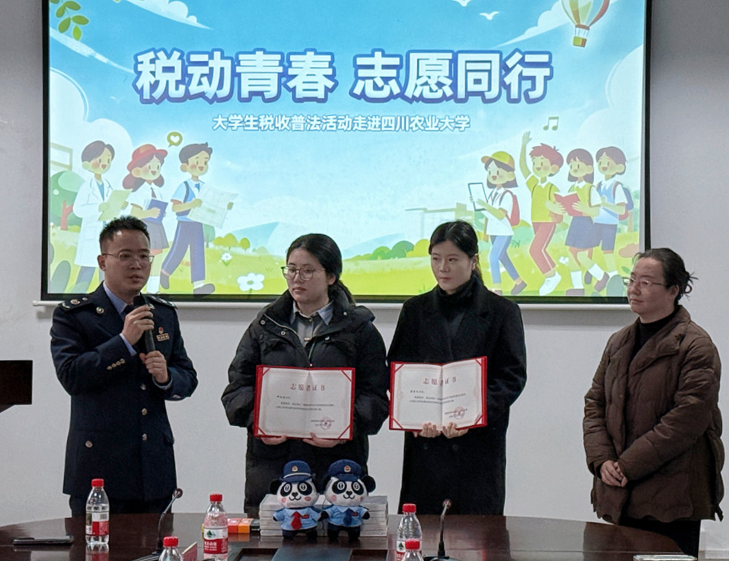 在活动当天,该校法学院学生邓鸿洁、龚昱文迎来重要一刻,她们从税务人员手中接过证书,作为新晋志愿者为“百名大学生税收普法志愿行”团队注入青春力量。