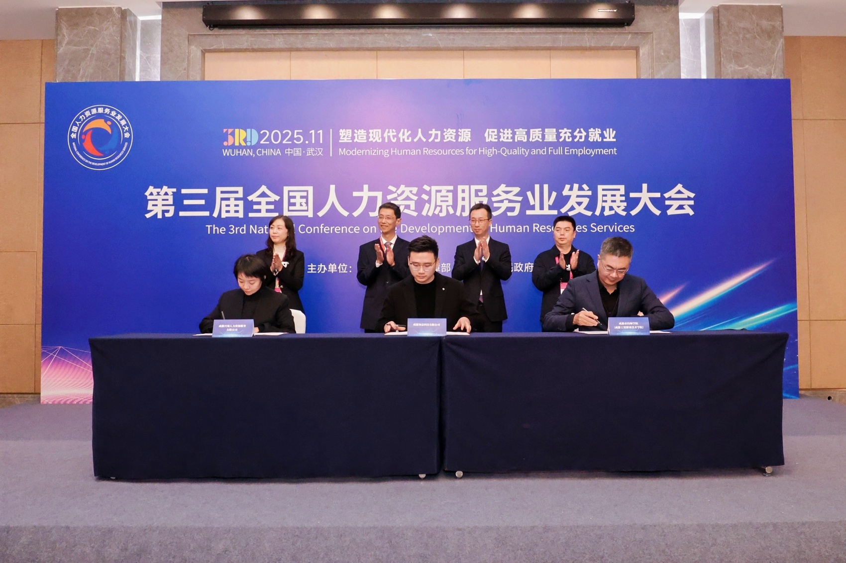 11月28日,第三届全国人力资源服务业发展大会在武汉启幕之际,广东领益智造股份有限公司(简称“领益智造”)、成都工贸职业技术学院(简称“工贸学院”)与成都兴蜀人力资源服务有限公司(简称“兴蜀人力”)正式签约,共建“自动化设备技术员培训中心”。这一以“产教评融合”为核心的合作精准契合成都先进制造业与现代服务业(简称“两业”)融合发展战略,创新构建协同育人体系,为破解技能人才供需错配、赋能区域产业高质量发展写下关键一笔。