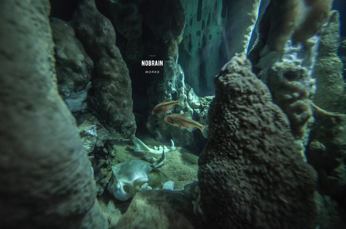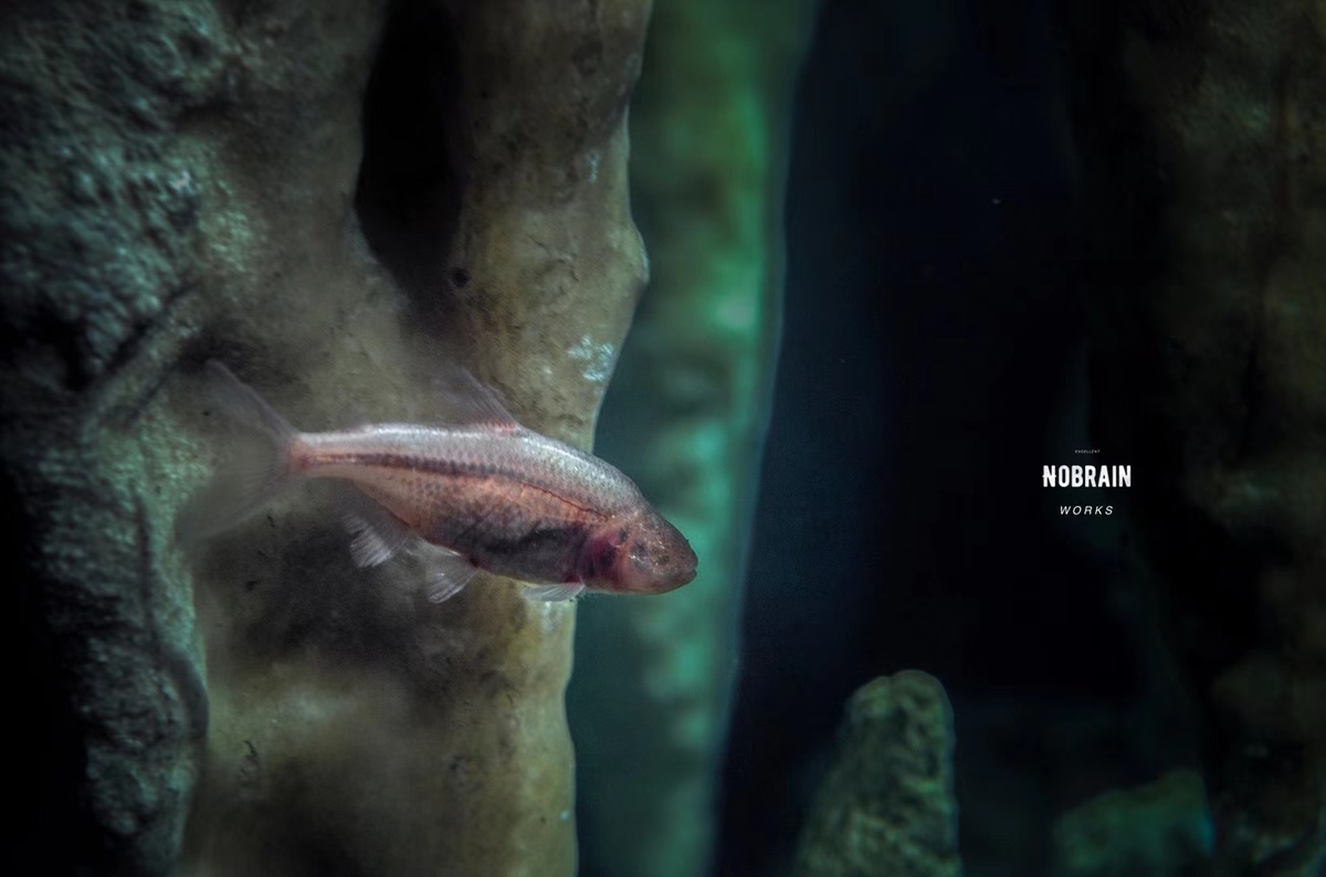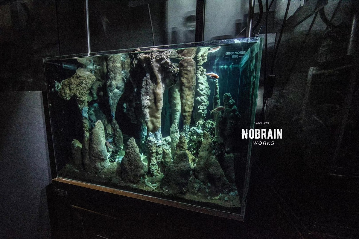 庄易介绍,他的作品是还原墨西哥的尤卡坦半岛地下溶洞,那里的地下溶洞是全世界最长的溶洞,也是世界洞穴潜水员的圣地。洞穴里面有一种鱼叫盲鱼,没有眼睛,里面还有各种动物的尸骨,甚至还发现了某种古人类的骨头。
