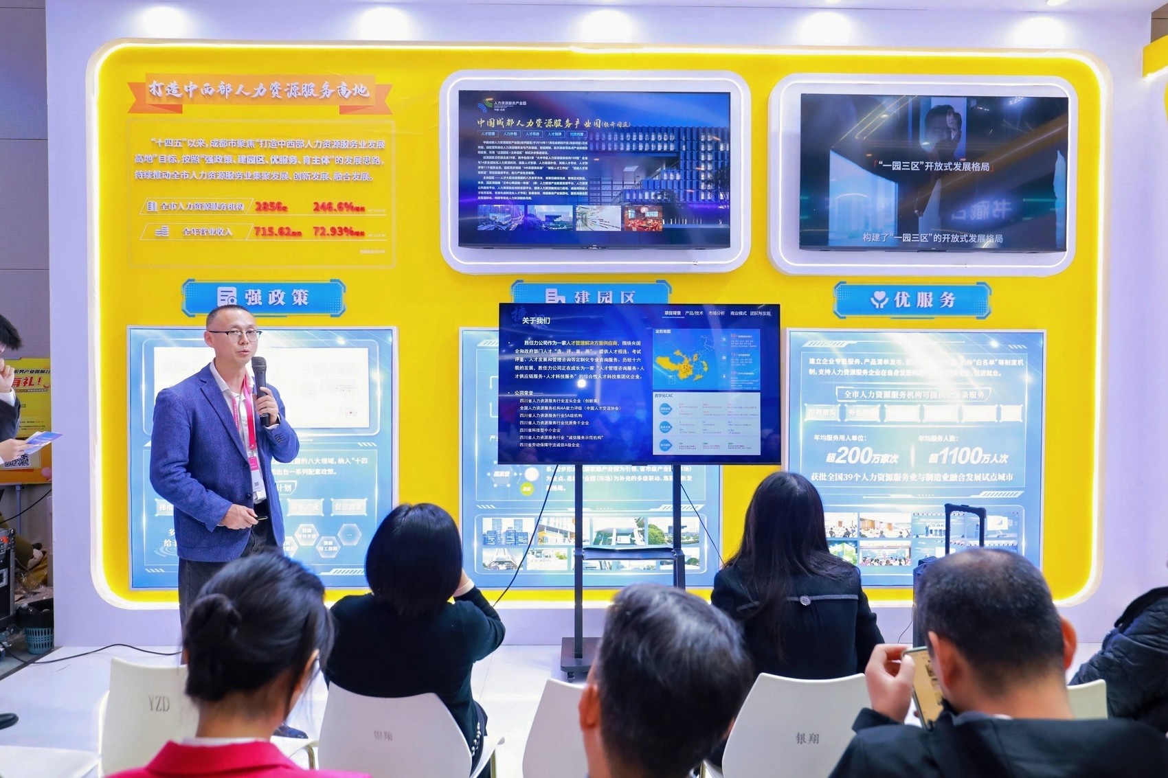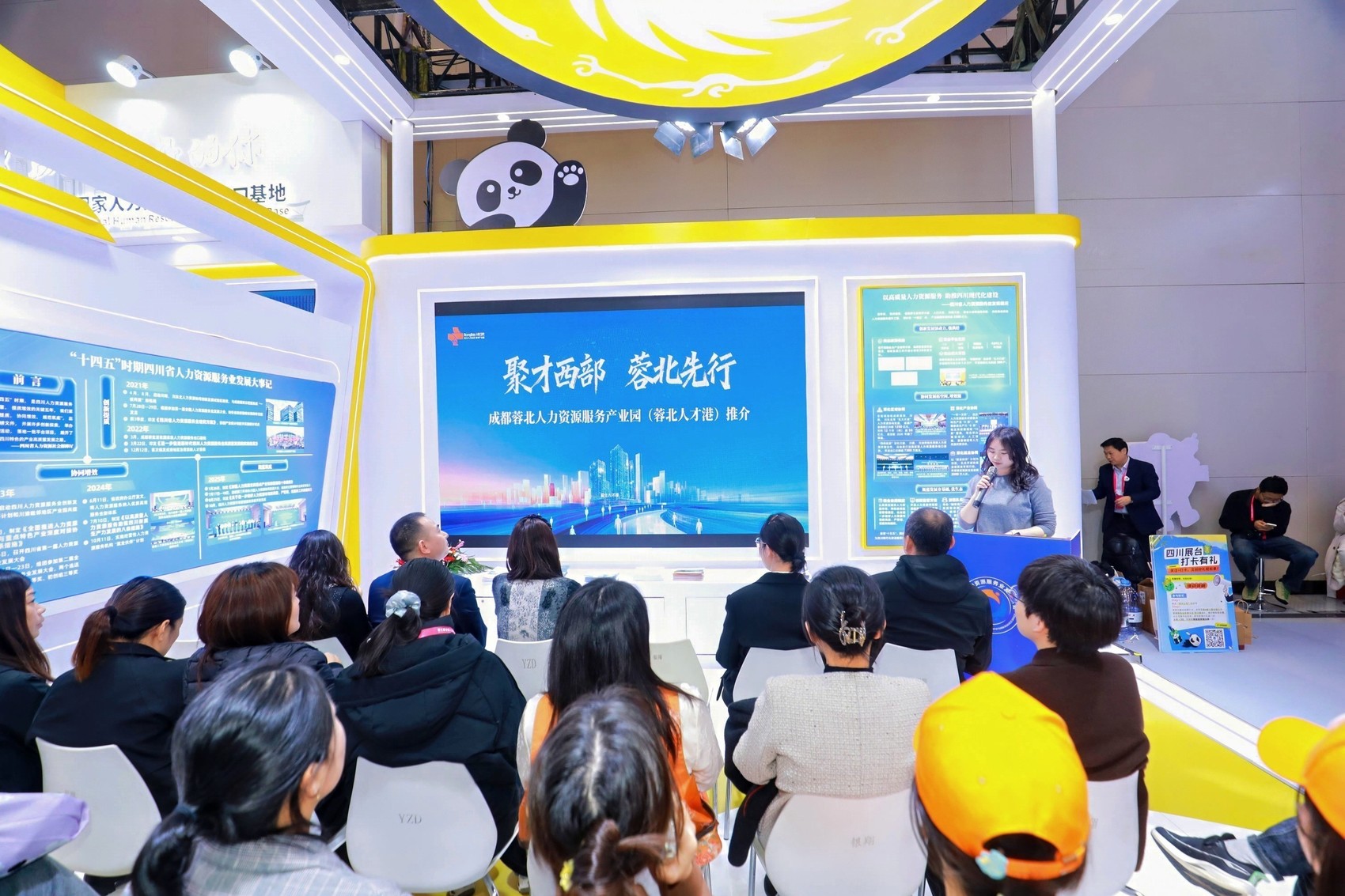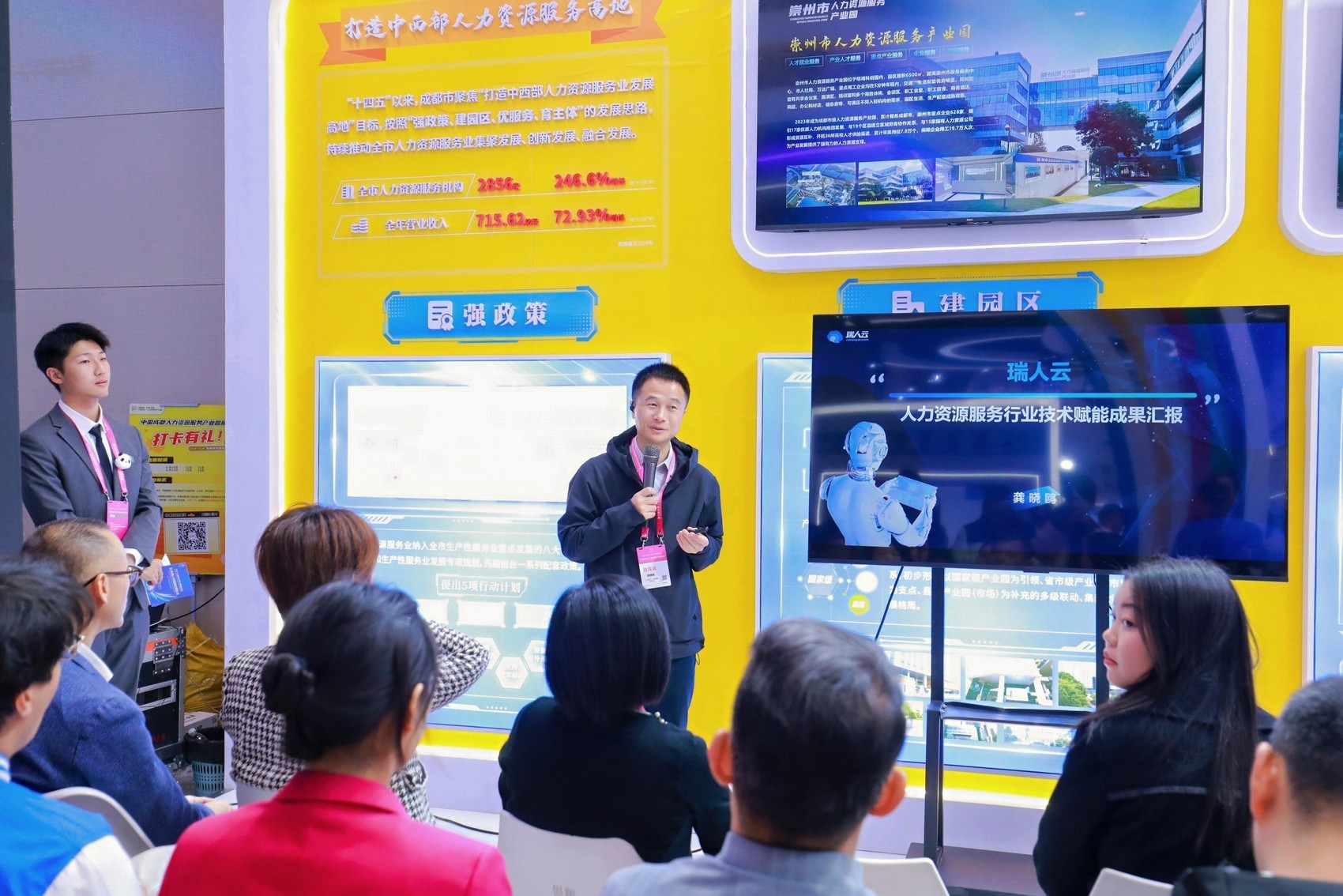 作为全国第7家国家级人力资源服务产业园,中国成都人力资源服务产业园无疑是焦点。自2017年高新园区开园以来,其“国际人才港、国际人才城”两大载体已形成超5万平方米的产业空间,既是国家人力资源服务出口基地,也是“蓉漂”人才发展的核心枢纽。截至今年10月,园区聚集168家专业机构,其中上市企业12家、自主培育主板上市企业2家,2024年营收突破220亿元。现场,园区负责人不仅展示了成都的扶持政策,更抛出“高端猎头+AI人力资源科技”的招商方向,吸引产业链高端企业共谋发展。
