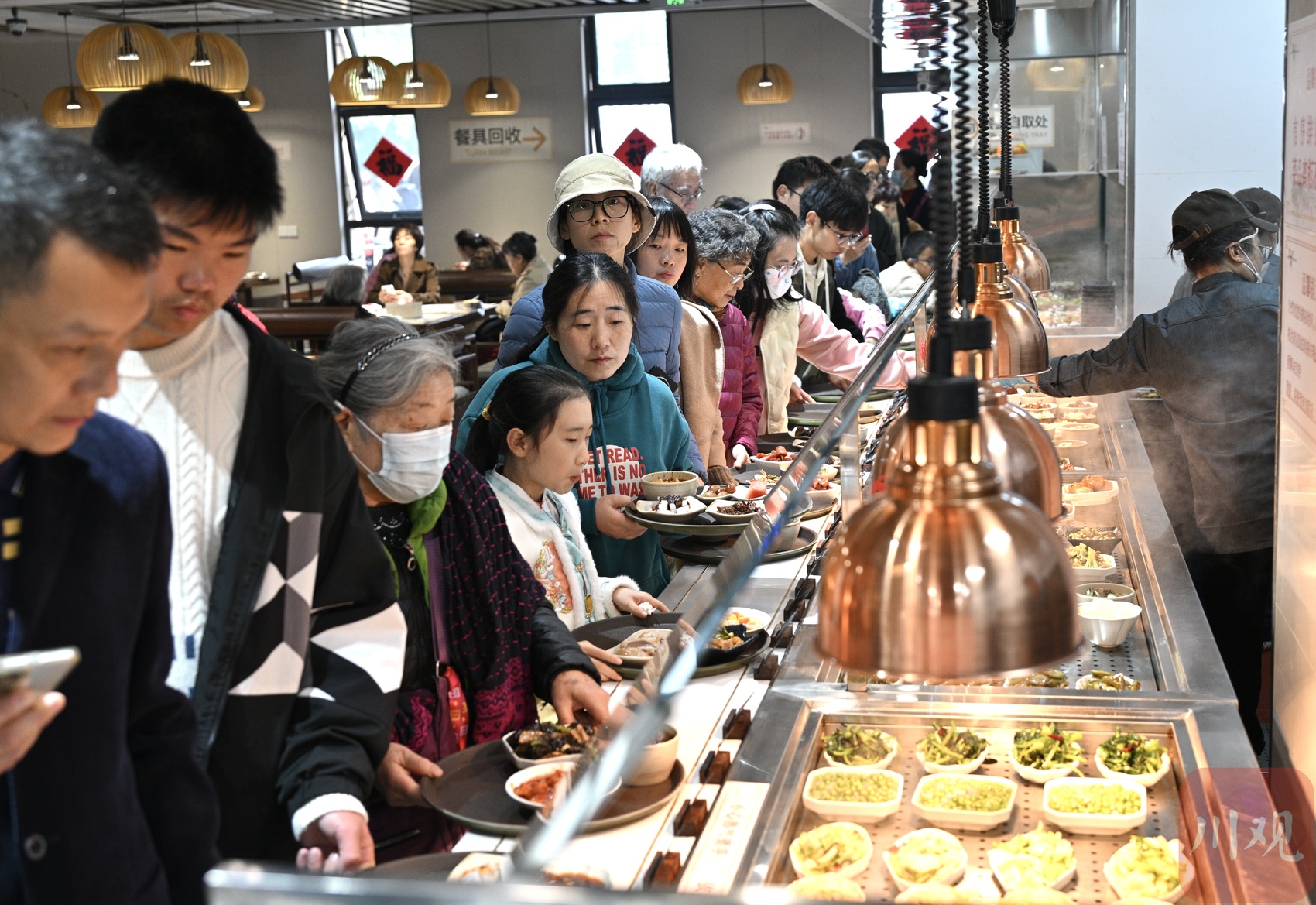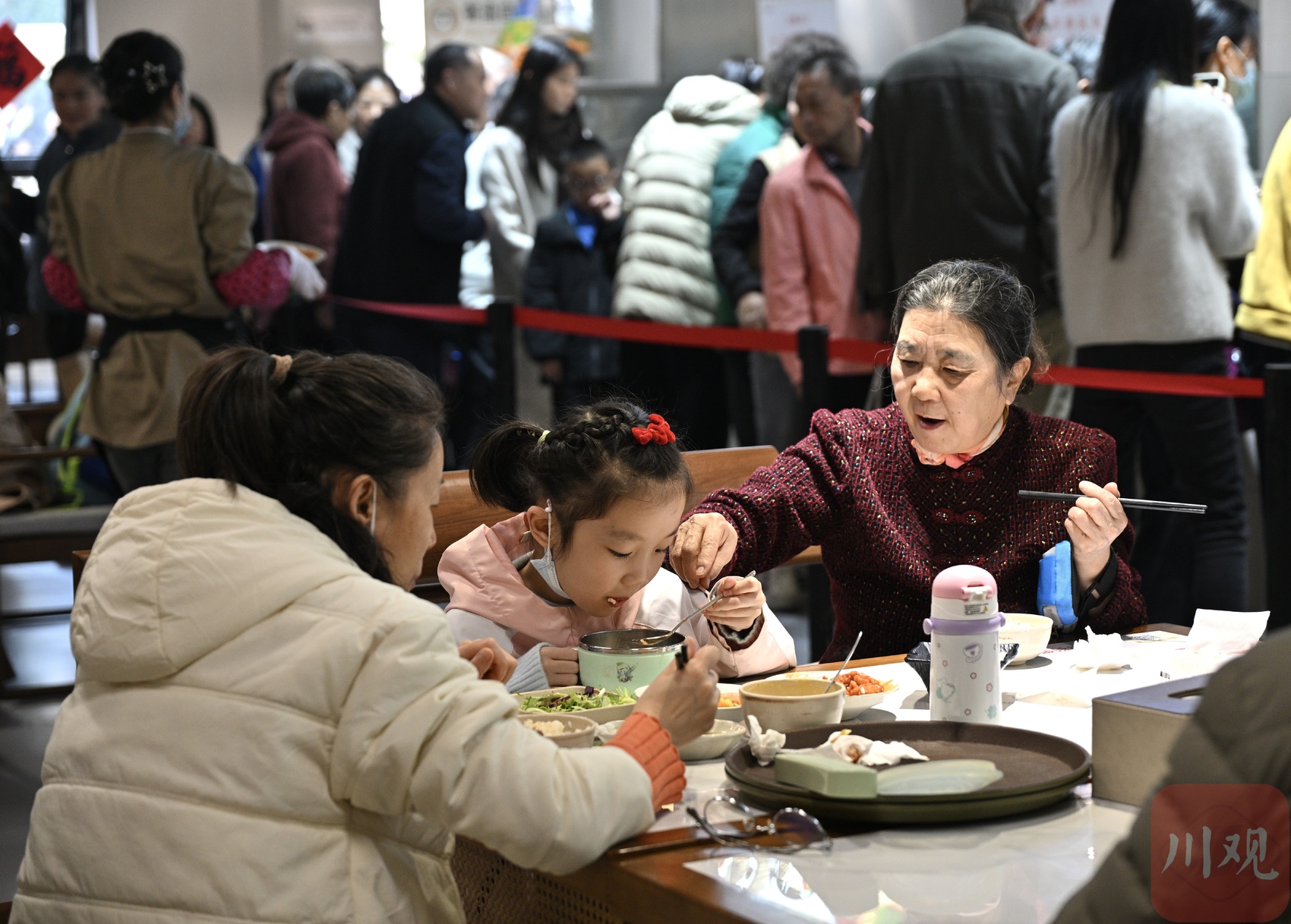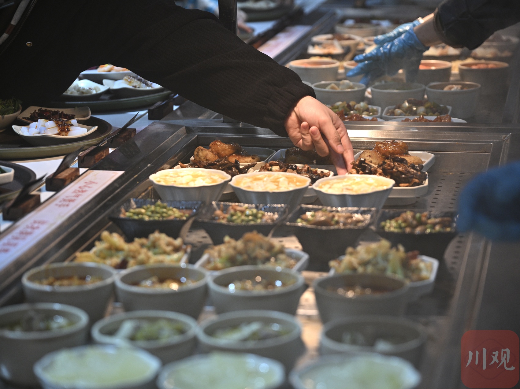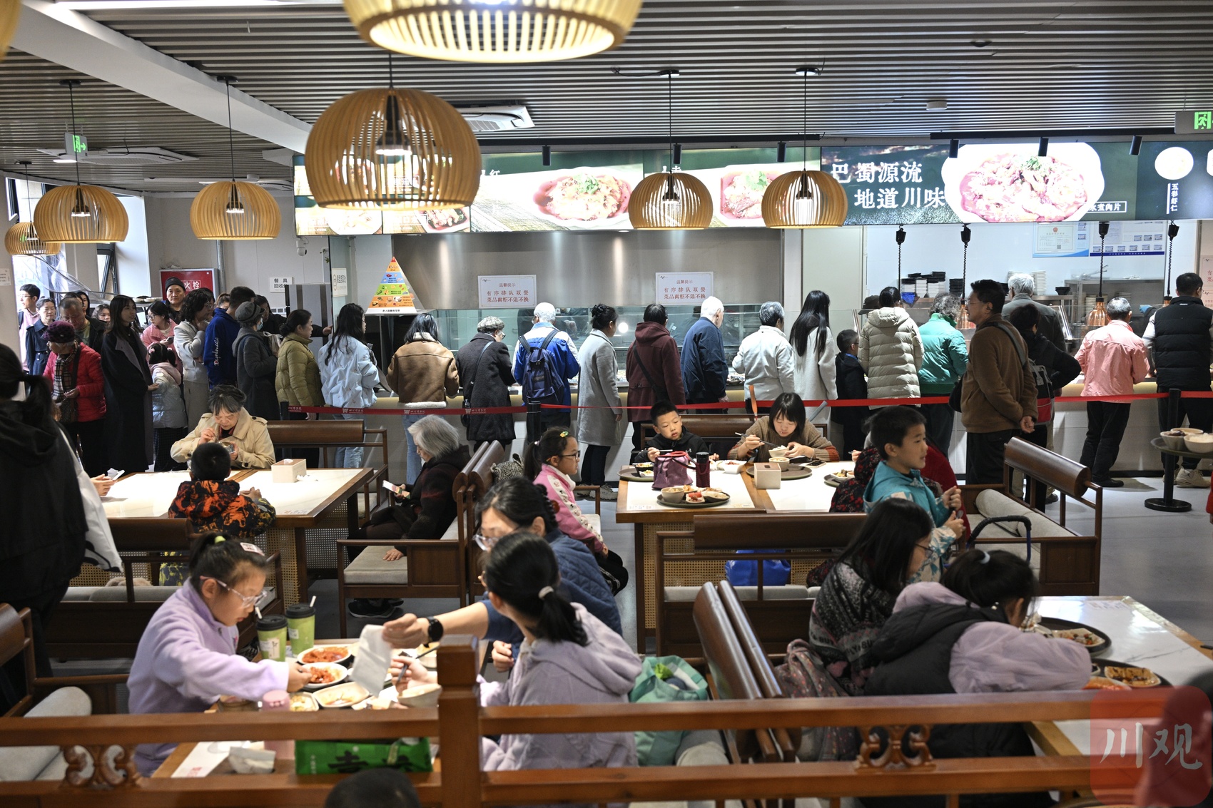11月29日中午,四川博物院生活体验中心餐厅内人头攒动,60余种小碗菜琳琅满目。川北凉粉、麻婆豆腐、回锅肉等地道川菜热气腾腾,吸引游客排起长龙。