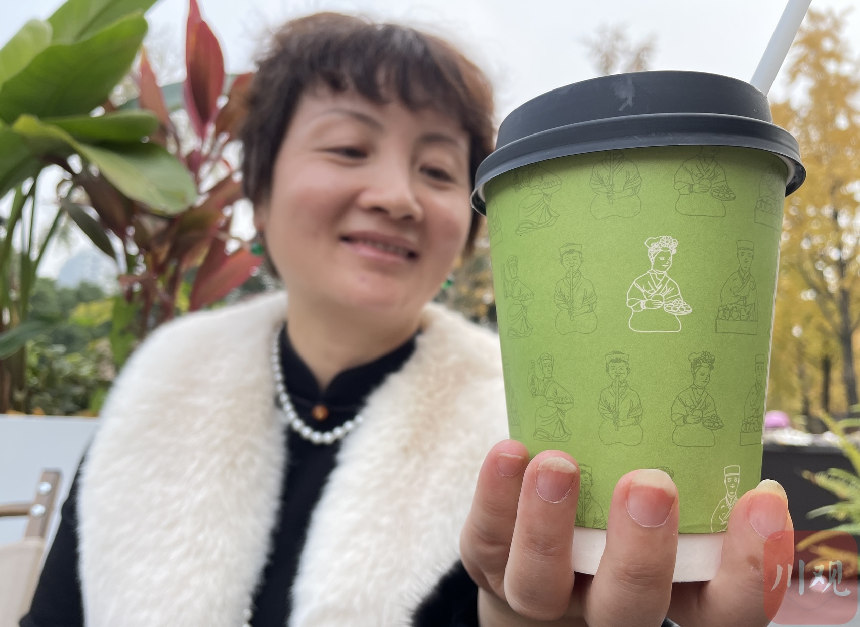 一位市民展示生活体验中心推出的文创咖啡杯。