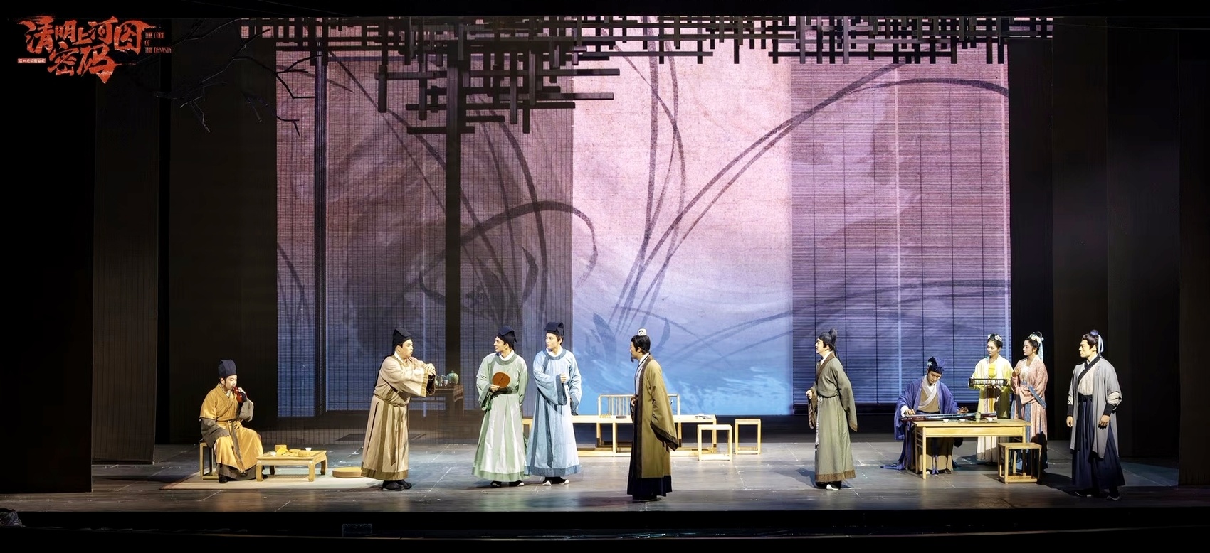 原作共有六卷,前五卷对应士农工商兵等不同角度的悬疑故事,最后收尾解谜。《清明上河图密码》首部舞台剧,故事线对应原作第一卷,选择原作中“八子案”与“梅船案”整合改编,搬上舞台。多层次舞台结构、精巧的机关设计和多媒体技术,将北宋汴京的城楼、街市、虹桥、河流动态复原,带领观众置身宋风雅韵之中。