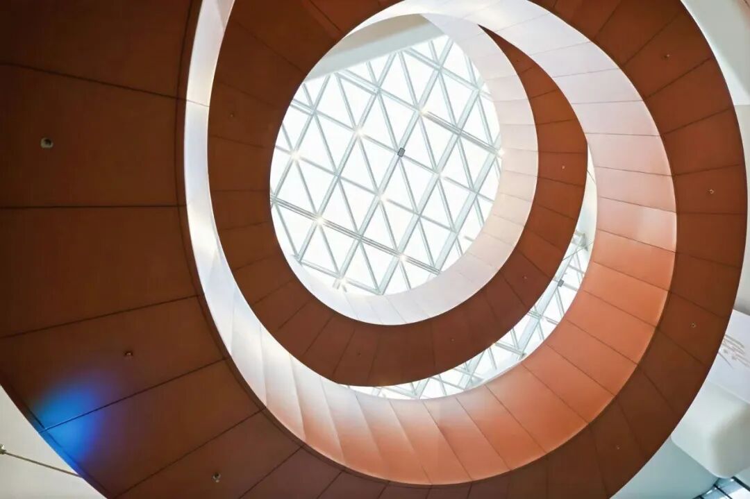 江立敏提到,4个混凝土卷筒作为结构核心,限定出展厅空间的同时,又塑造了流动的公共空间——峡谷般的廊道和交汇的中庭,尤其是中庭悬挂的巨型旋转楼梯,其独特性和挑战性是国内罕见的。“它成为视觉的焦点,也是为驱动空间流动的核心。”