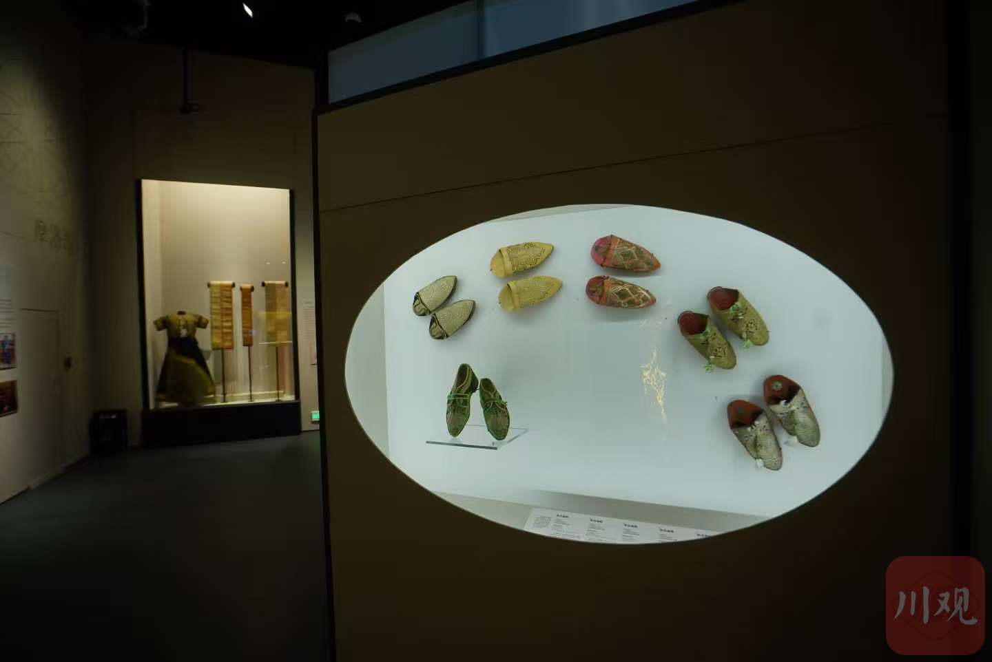 展陈设计师、成都博物馆陈列设计部副主任刘蕾介绍,设计团队以服饰为核心载体,将金线工艺作为视觉主线贯穿全场,并为不同文化区域赋予专属色彩。“我们期待观众不止于欣赏服饰之美,更能沉浸式邂逅文明交流的独特魅力。”