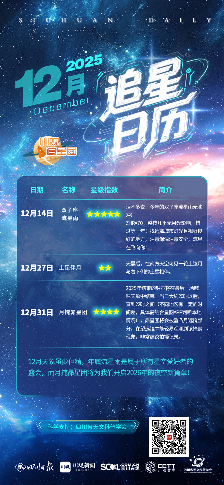 进入今年最后一个月,天象剧场放大招了:三大天象虽少但精,尤其是月中的双子座流星雨是今年最后一场流星雨,将成为所有星空爱好者的盛会,而月掩昴星团将为我们开启2026年的夜空新篇章,这份追星指南赶紧码住!