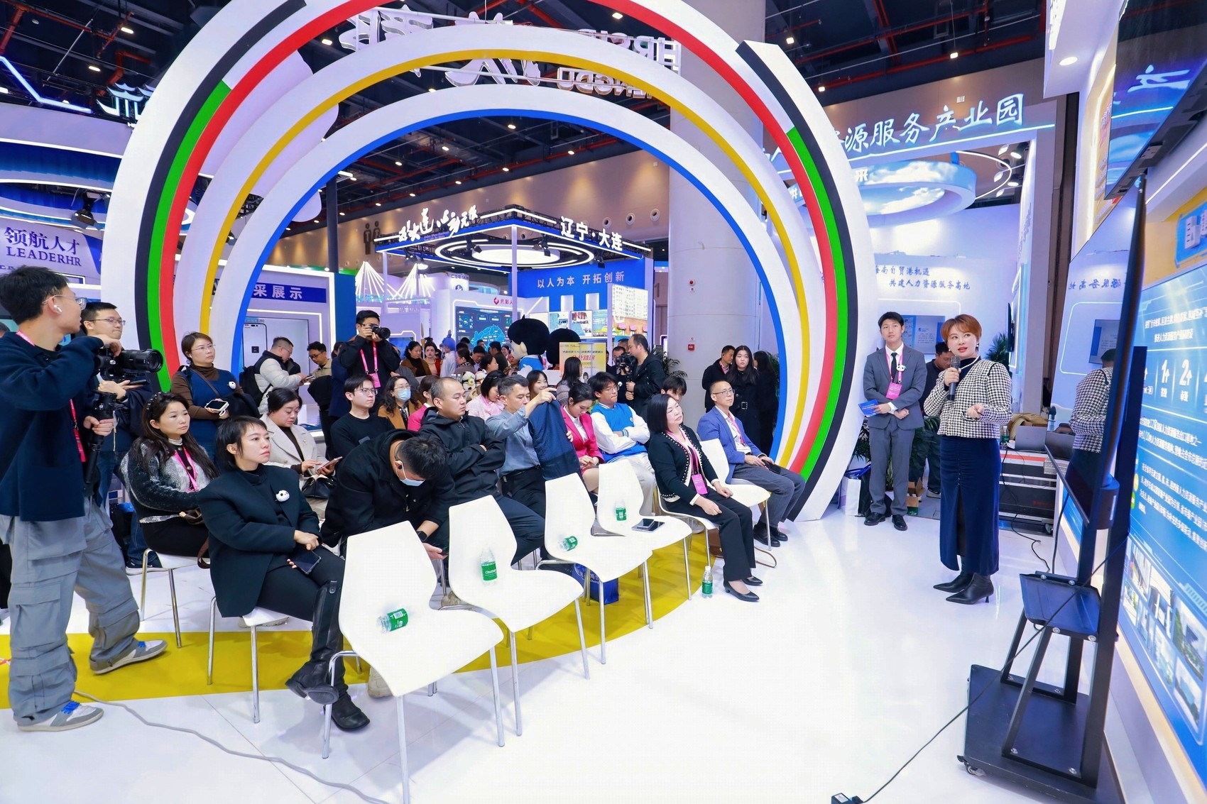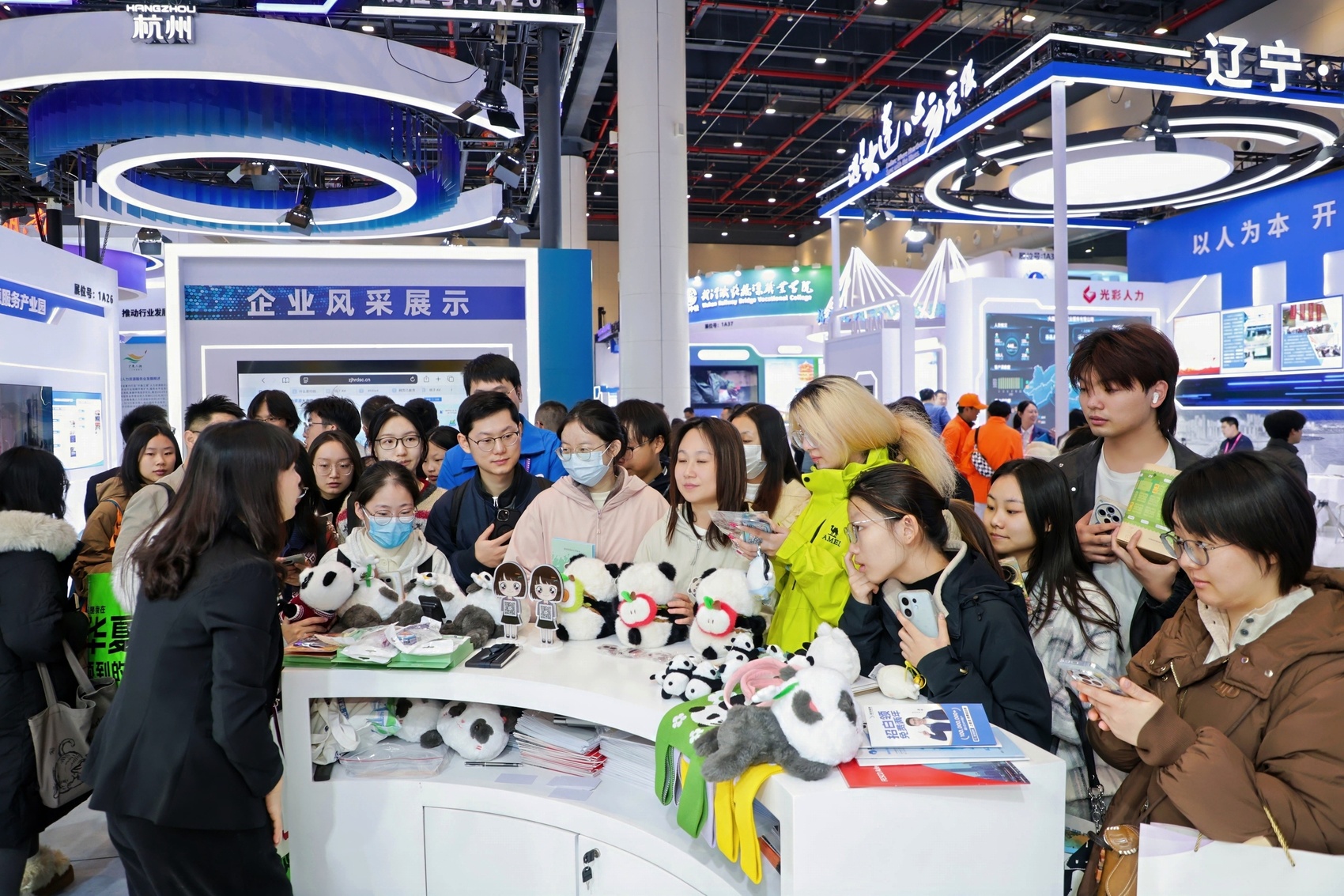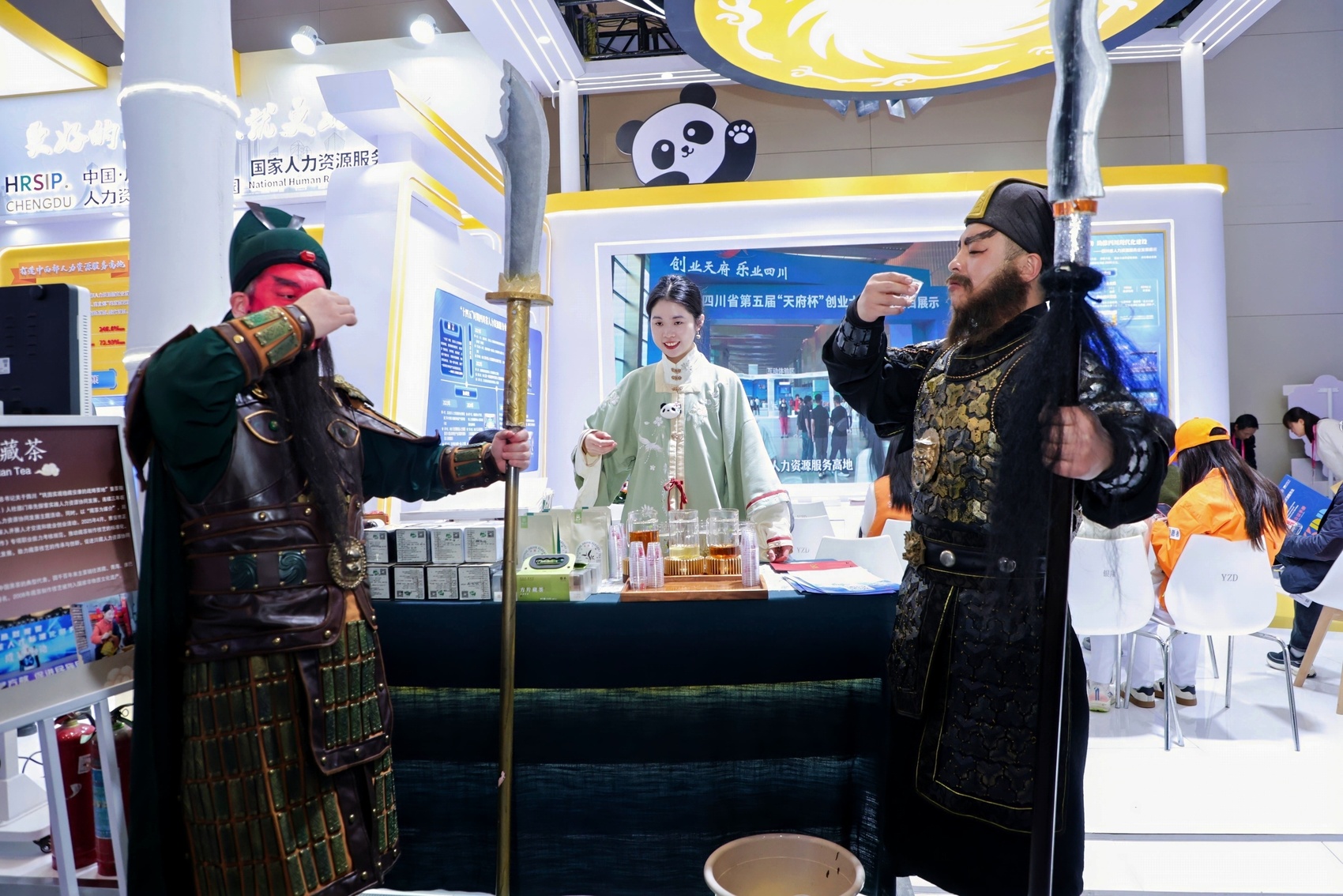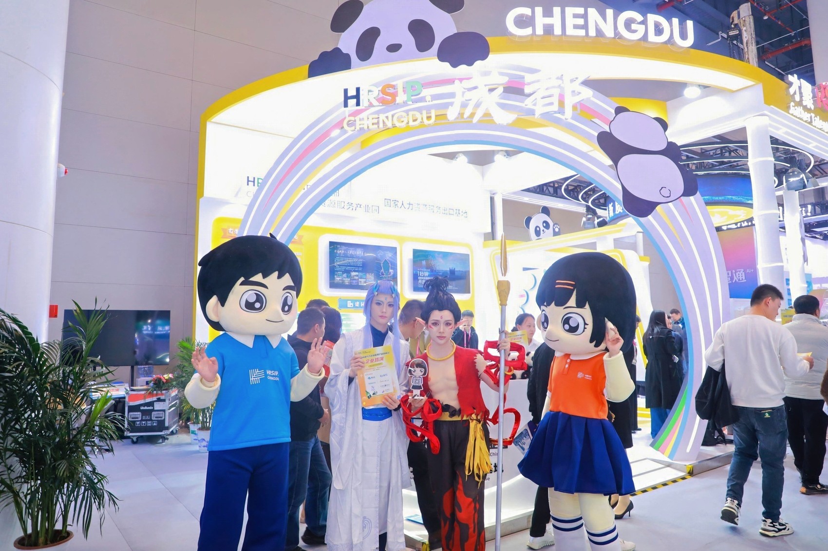 旁边的中国成都人力资源服务产业园展台顶部趴卧的卡通熊猫,瞬间将人带入“天府之国”的闲适与雅致。成都本土热门文创IP哪吒、敖丙的角色扮演者惊喜现身,与熊猫造型互动巡游,形成“熊猫配哪吒”的奇妙组合,引爆现场,与会者纷纷合影。