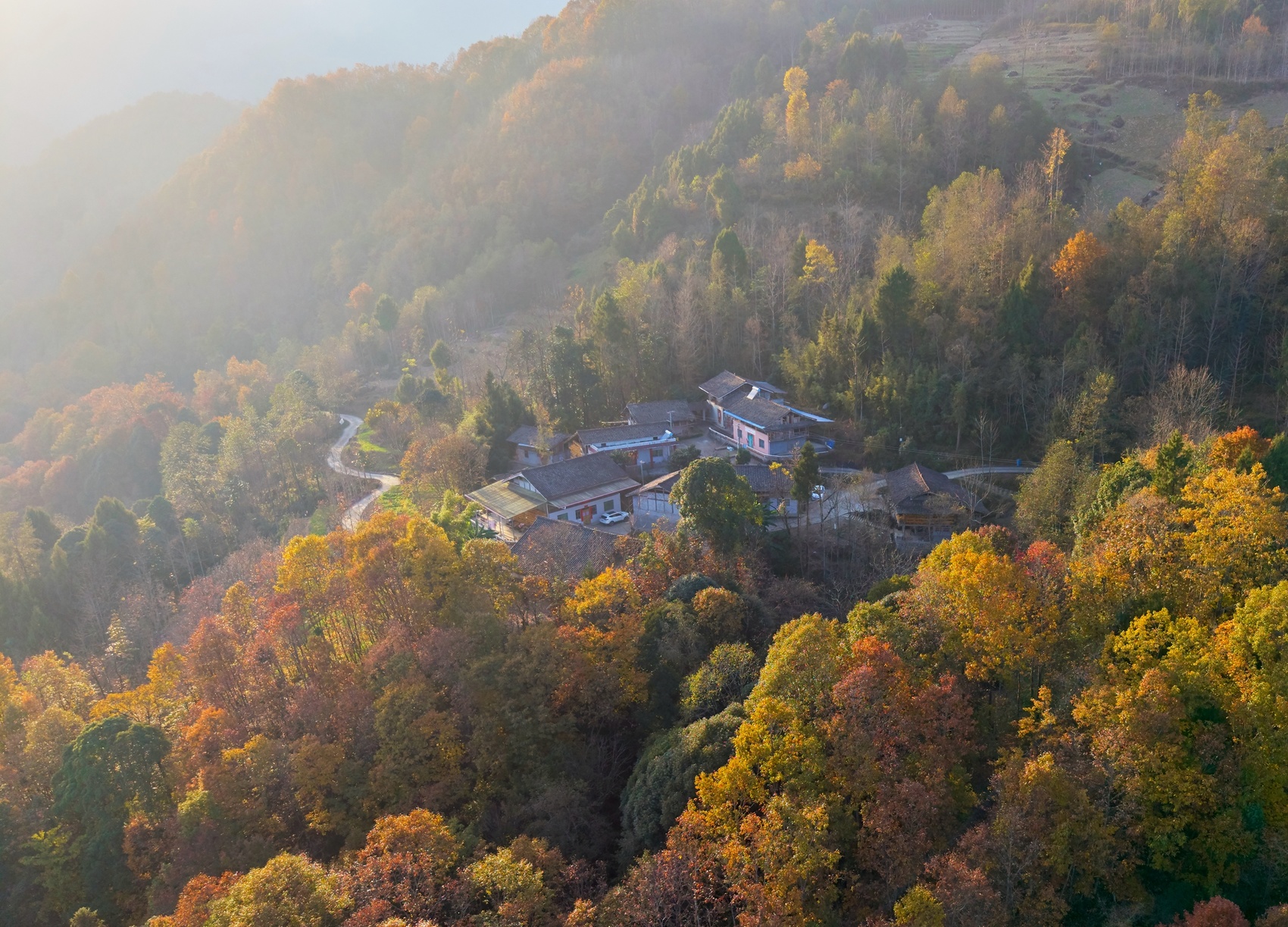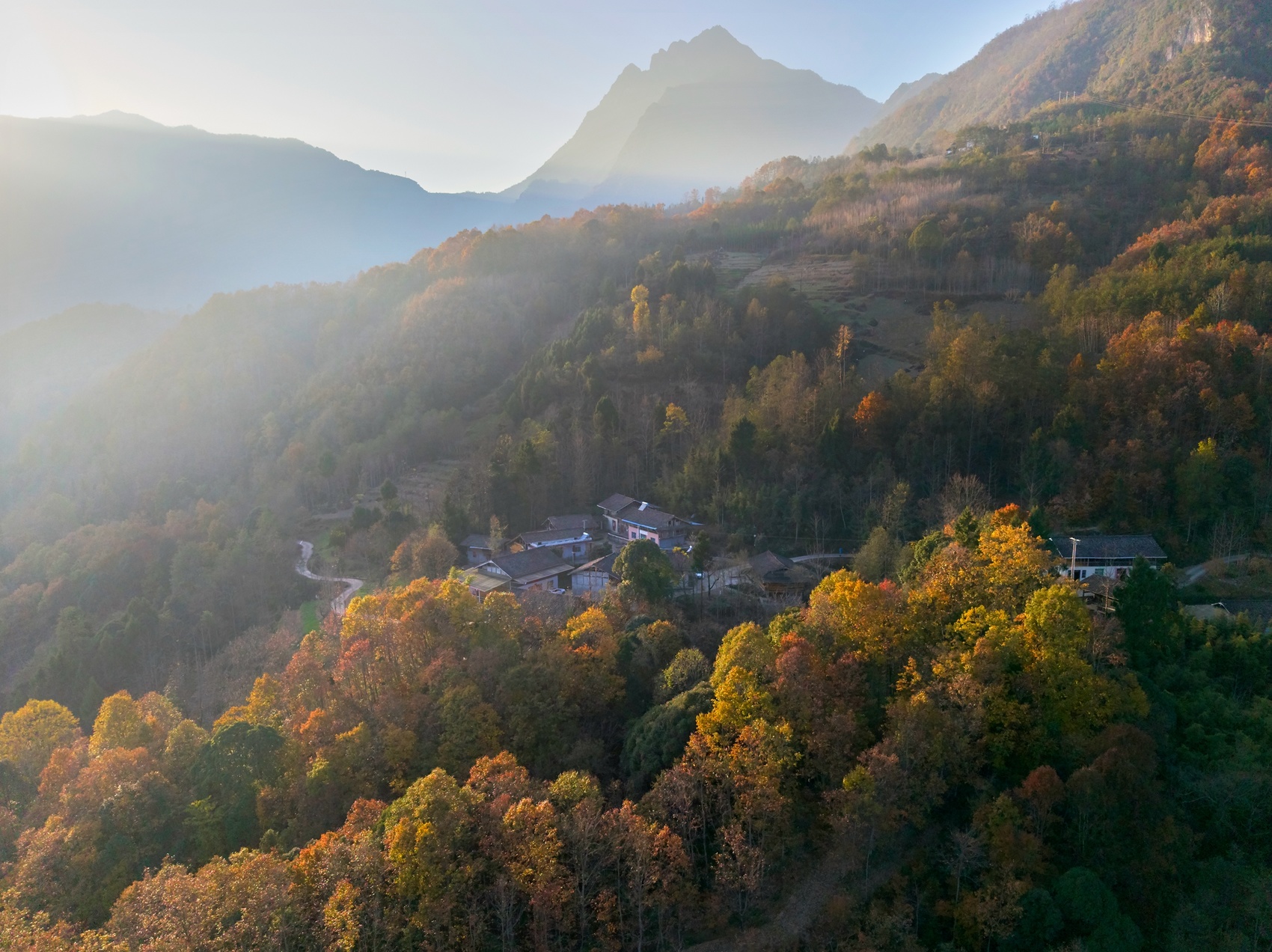 彩林深处,一座座传统川西民居若隐若现。青瓦白墙的村落静静依偎在山谷间,炊烟袅袅升起,与山间薄雾交融。村落里,老人们坐在彩林下的院子里,享受着初冬温暖的阳光,构成了一幅人与自然和谐共处的美丽画卷。