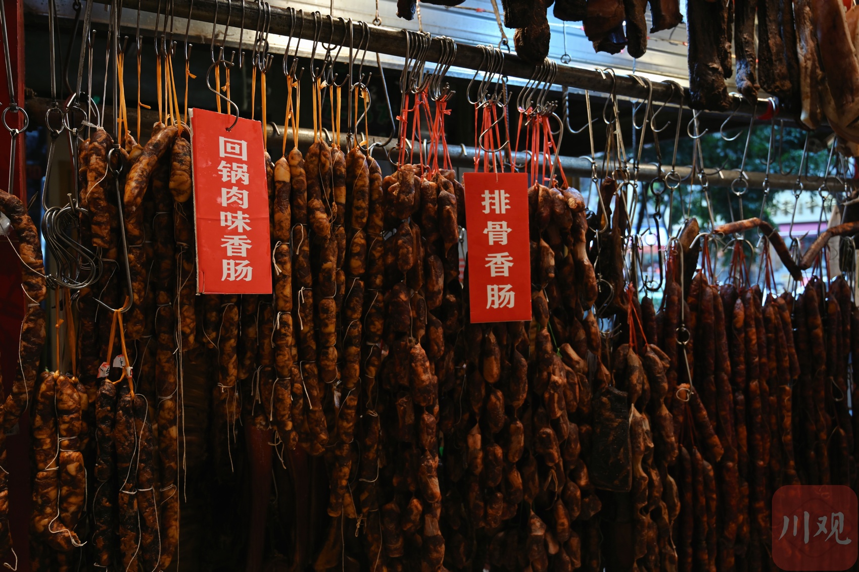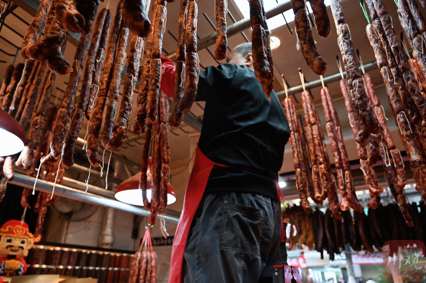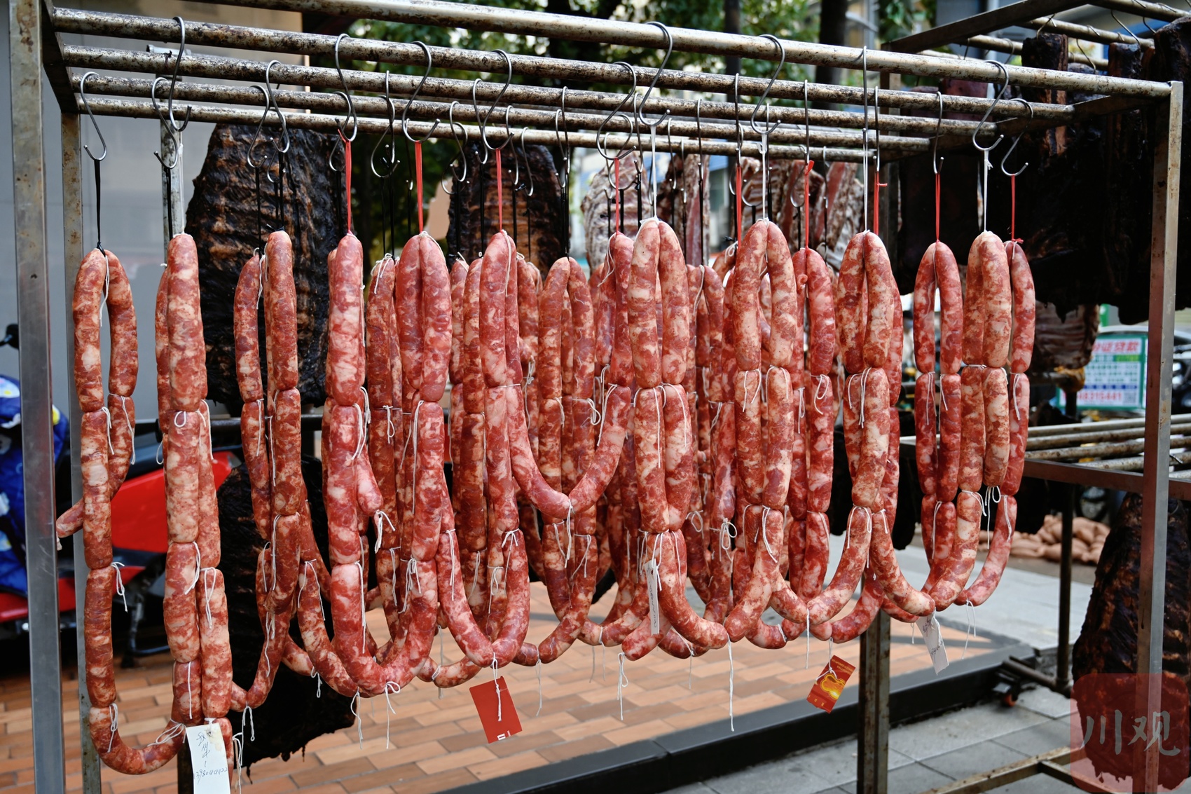 干燥天气+传统工艺=地道川味香肠。这不仅是生意,更是文化传承,希望这样的老街一直红火下去