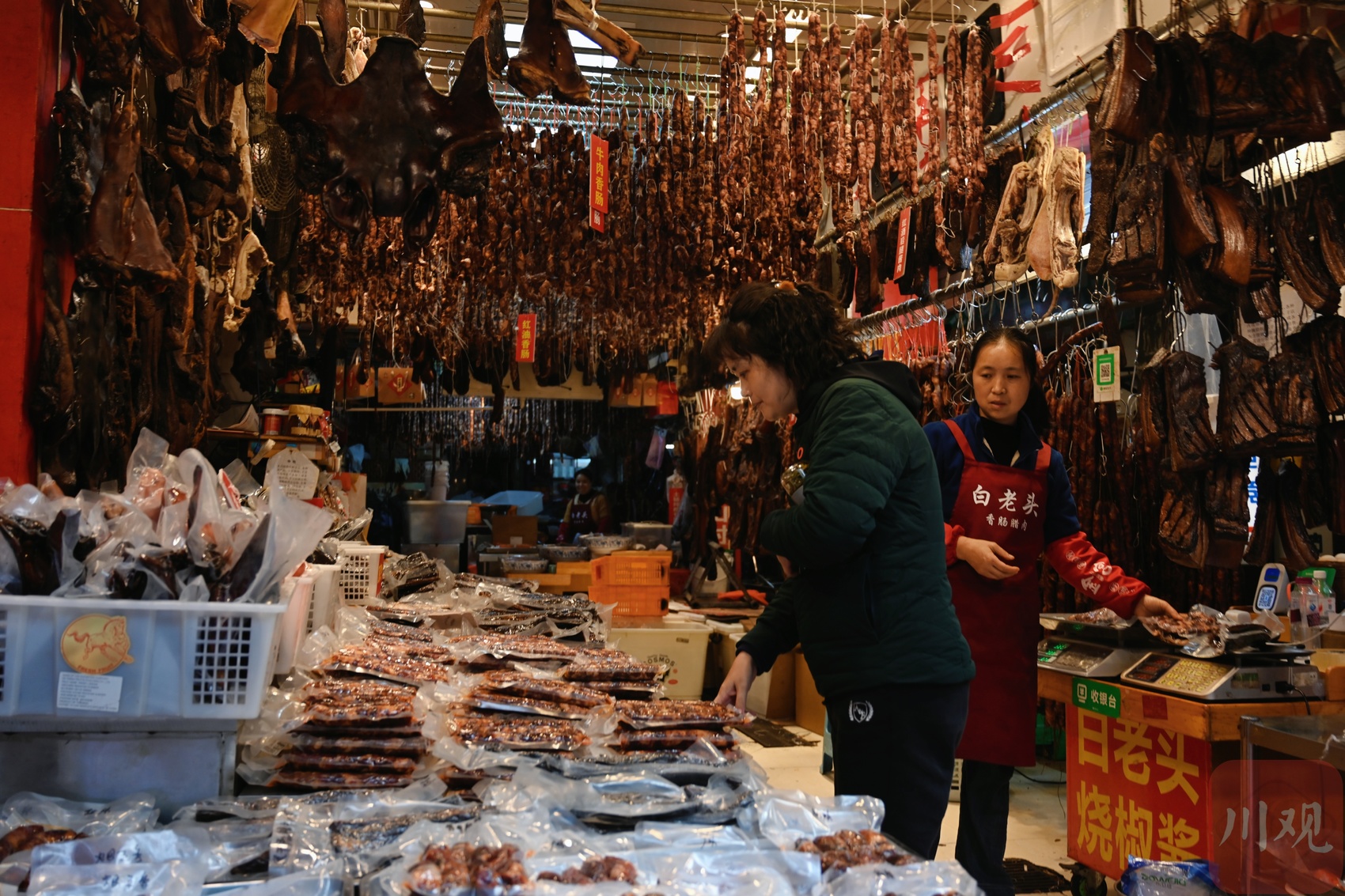 11月30日,在素有“成都香肠腊肉一条街”之称的新开寺街,各家店铺门前已挂满灌制好的香肠。记者从多家商户了解到,目前最受欢迎的仍是川味香肠,售价普遍在每斤35元至38元之间,线上线下销量均十分可观。商家普遍表示,近期天气干燥,非常有利于香肠的晾制,预计冬至之后将迎来一波预订高峰。