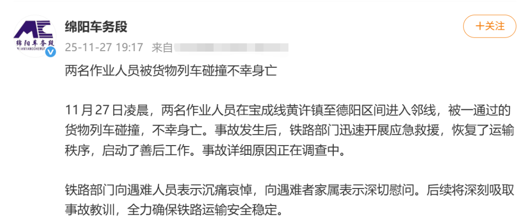 11月27日19时许,四川省成都铁路局绵阳车务段发布消息称,两名作业人员被货物列车碰撞不幸身亡。