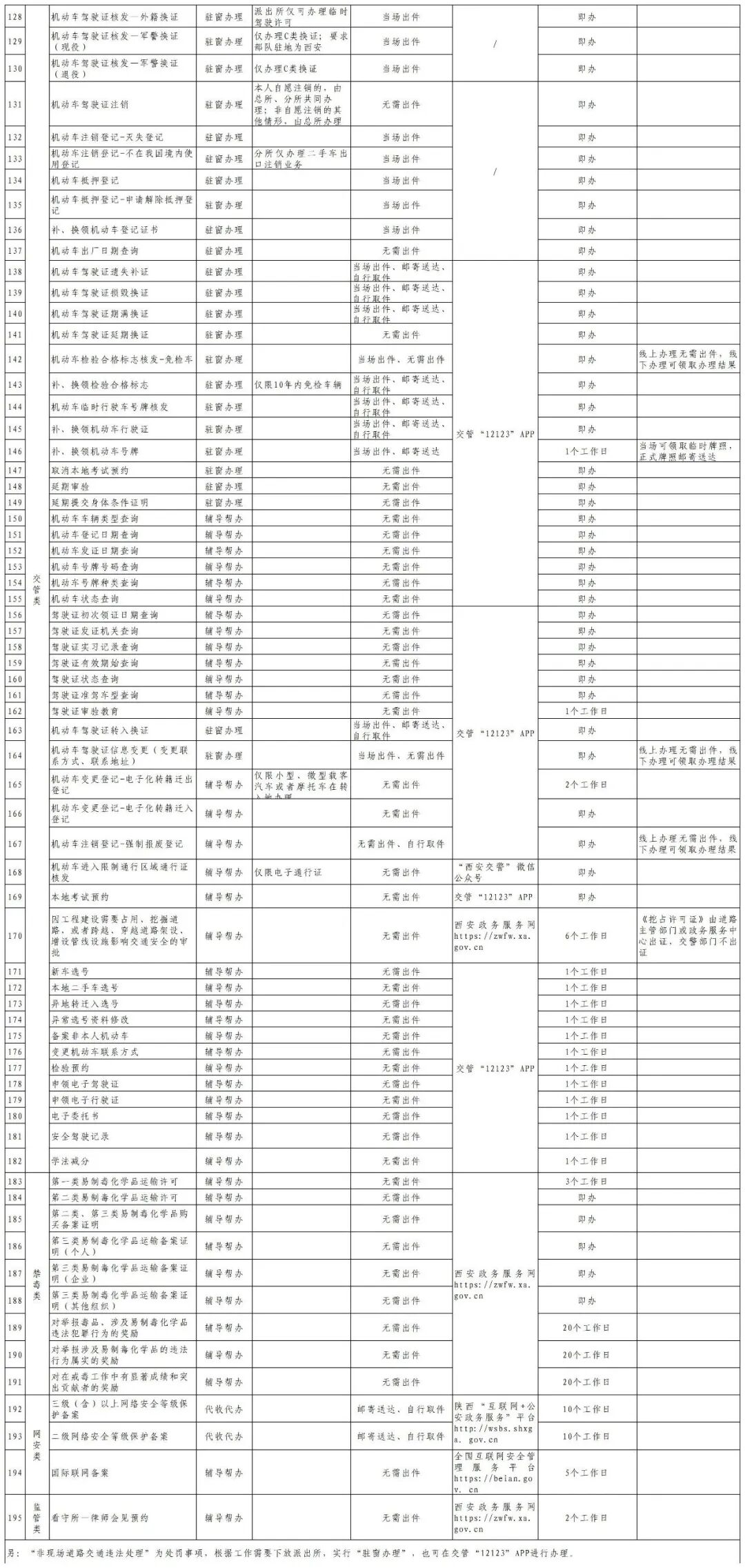 为持续提升为民服务质效,深入践行“连心警务”,方便企业群众近办、快办、好办公安业务,西安市公安局构建了“一网通办、一所通办、一次办成”的“三个一”公安政务服务体系和由1个市级公安专厅、20个区县级政务服务大厅、190个派出所“公安综合服务室”组成的“15分钟公安便民服务圈”。目前,229项公安政务服务事项中,156项已实现“一网通办”,195项已实现“一所通办”,228项已实现“一次办成”。